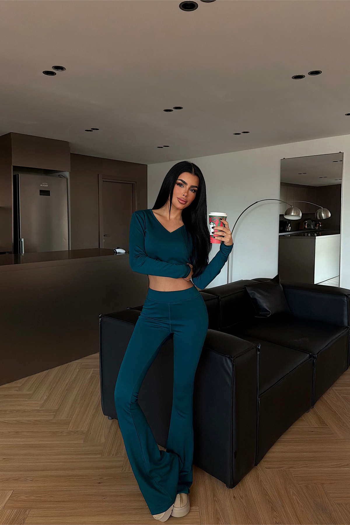 Şıklığı ve rahatlığı bir arada sunan Petrol Yeşili Aesop Takım, modern çizgisiyle gardırobunuzun vazgeçilmezi olmaya aday. Yüksek bel, akıcı kumaş ve bacak boyunu optik olarak uzatan ispanyol paça kesim, her vücut tipine zarif bir görünüm kazandırır.