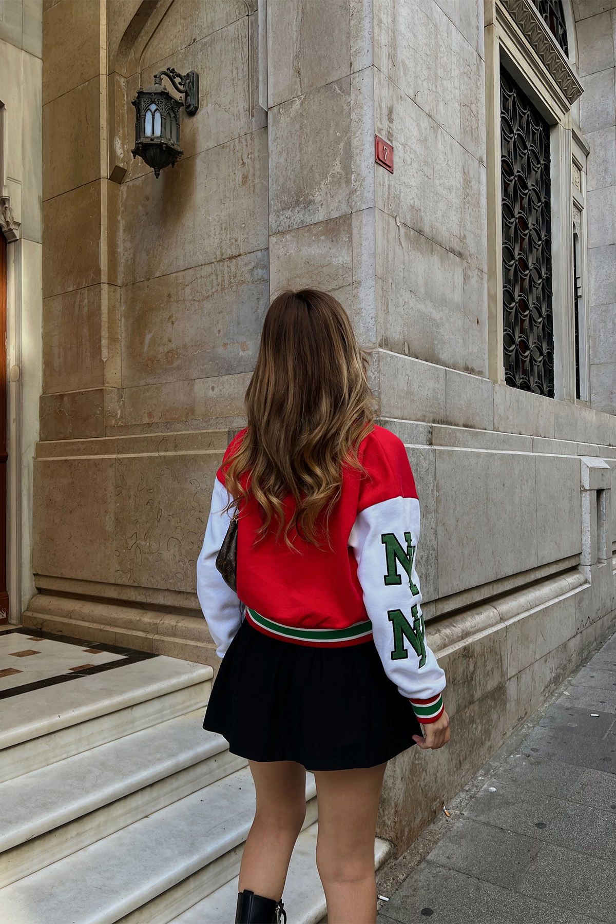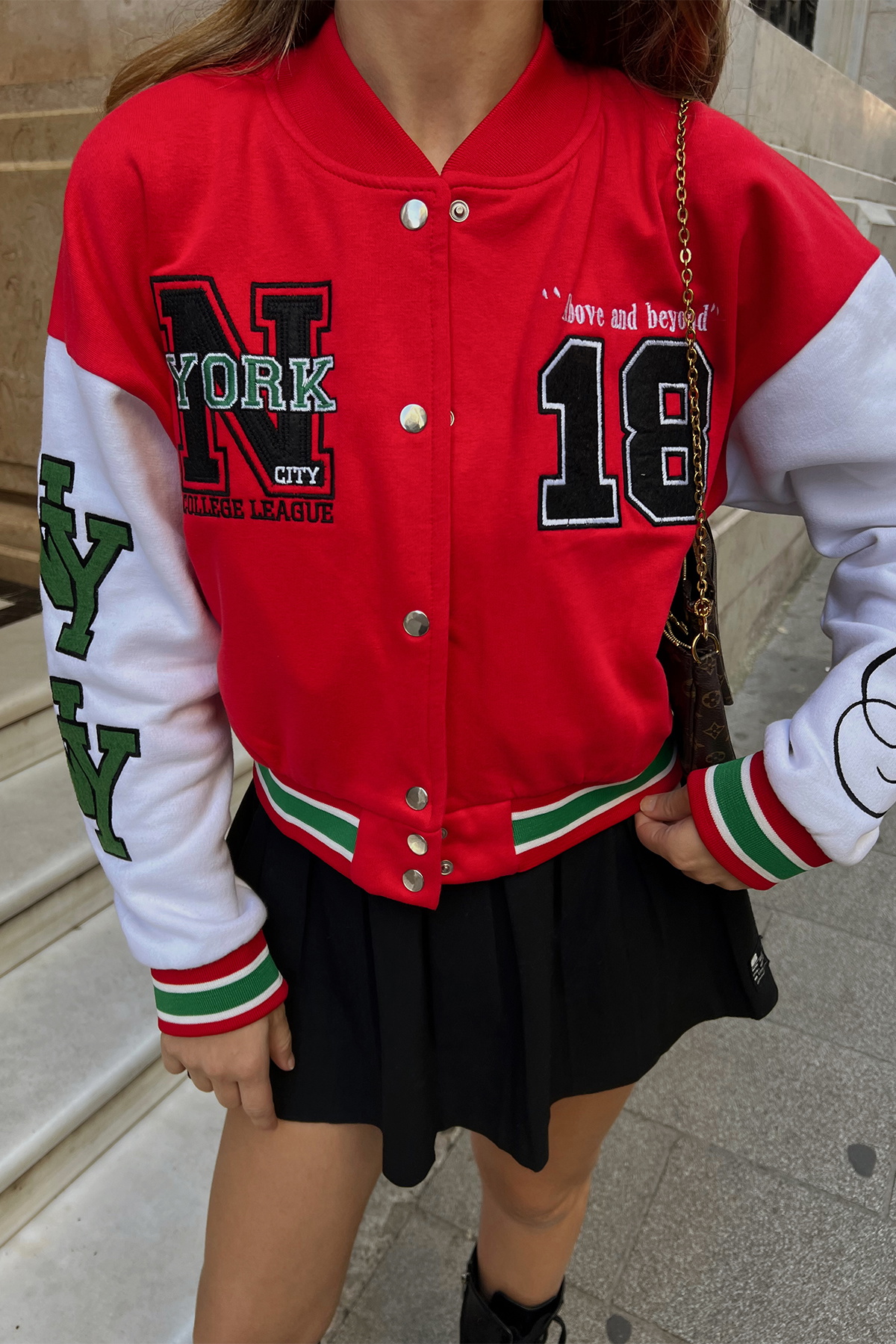 Red NYC College Jacket in this photo is S size.
