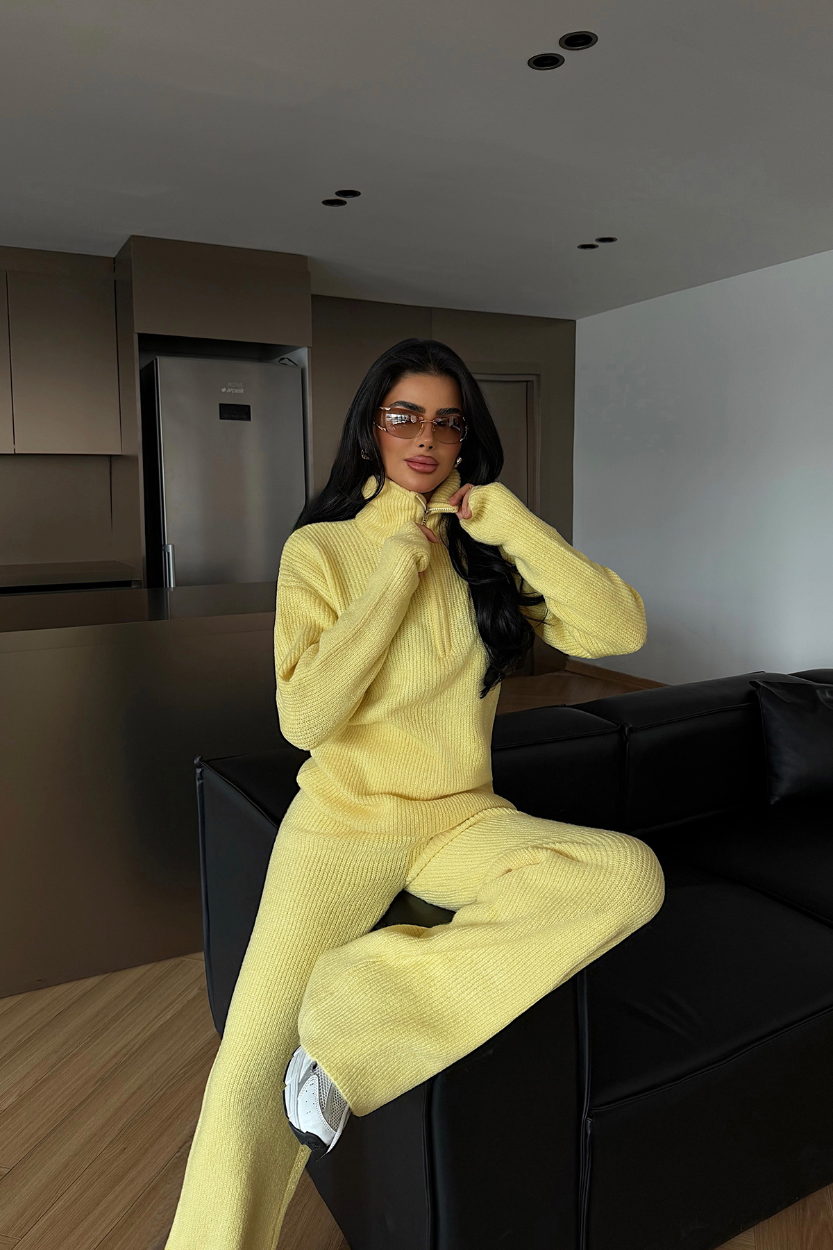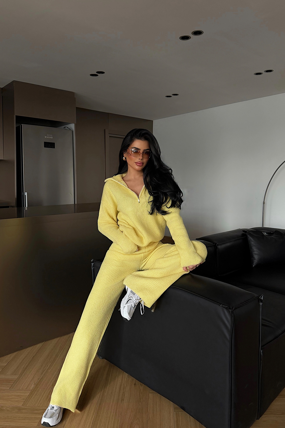 Bu modern takım, sarı renginin enerjik duruşu ve fermuar detaylarıyla hem gündelik stilinize sportif bir dokunuş katıyor hem de konforu ön planda tutuyor. Gün içinde rahatça hareket etmek isteyenler için ideal bir seçim.
