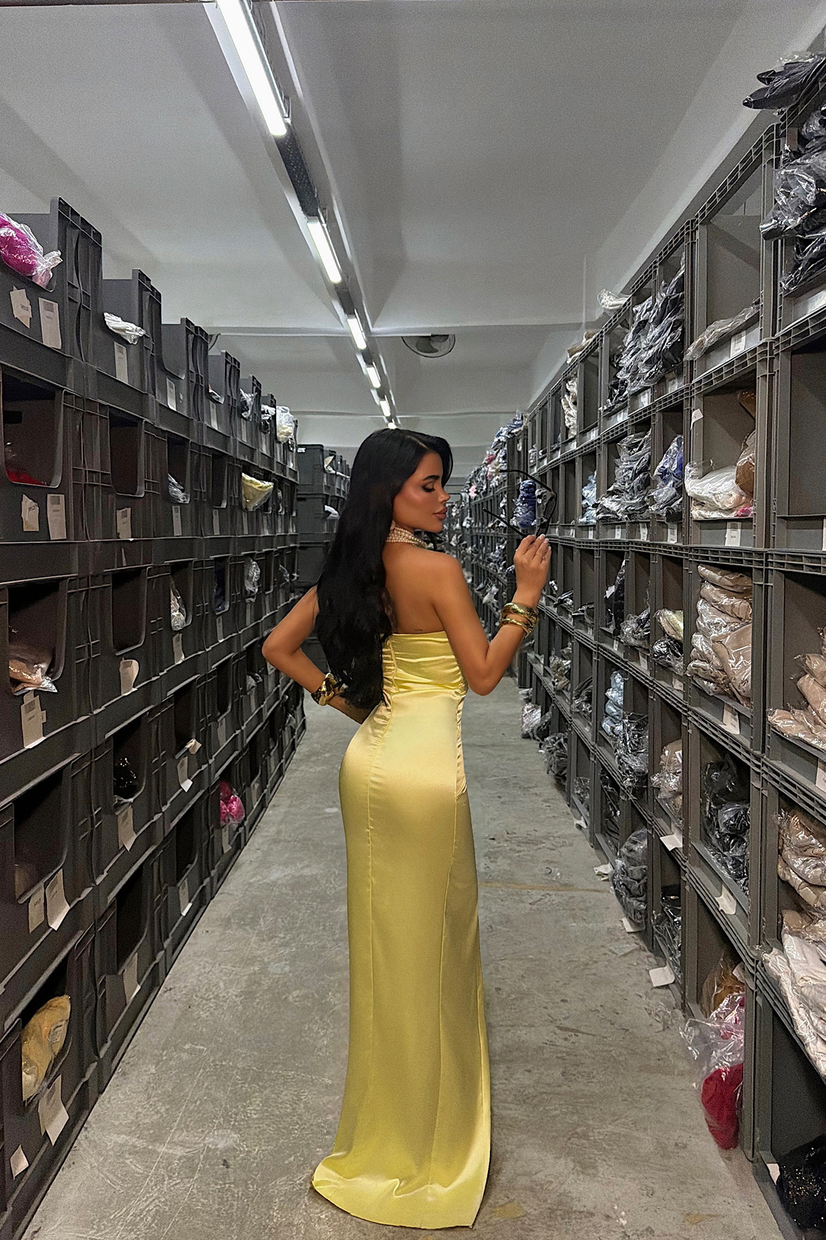 Straplez tasarımı ve vücuda oturan formuyla öne çıkan bu uzun elbise, iddialı ve feminen bir siluet sunar. Göğüs kısmındaki modern kesim ve ön yüzeyde yer alan geometrik detaylar tasarıma dikkat çekici bir karakter kazandırır. Vücuda oturan kalıbı hatları zarif şekilde vurgularken, uzun ve akıcı etek kesimi dengeli bir görünüm oluşturur.