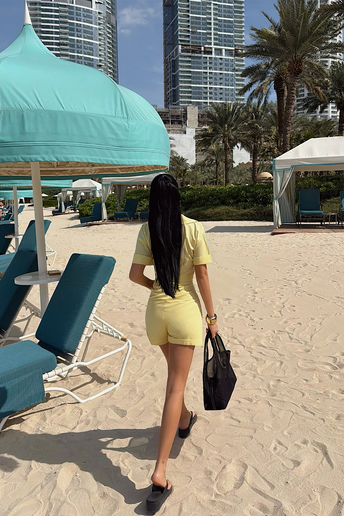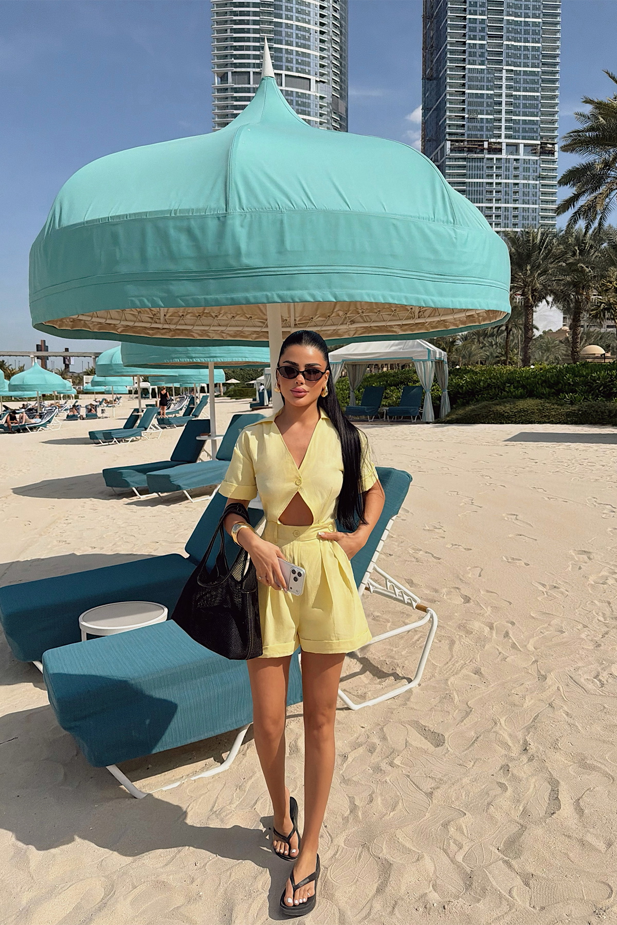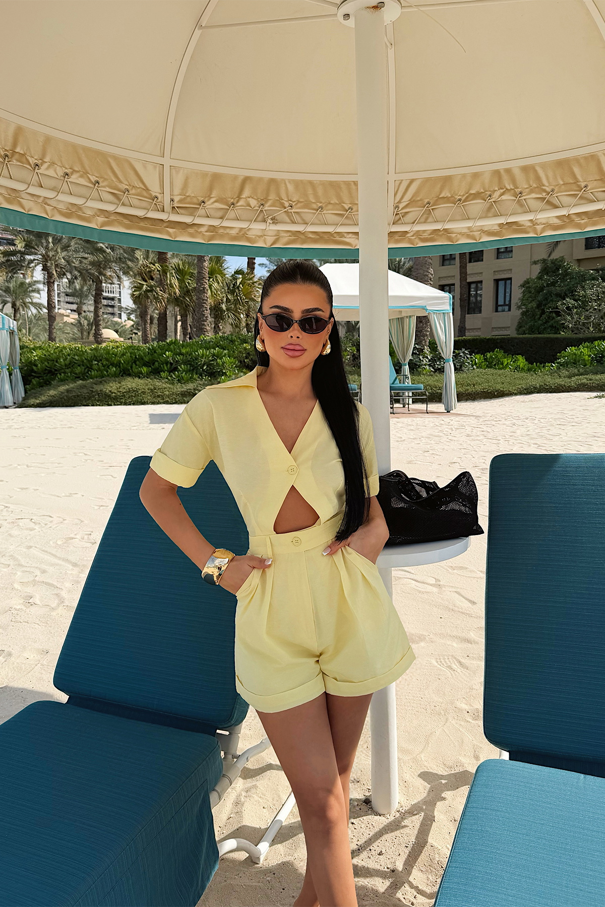 Bu tulum, kısa kollu yapısı ve şort formu ile rahat ve dengeli bir siluet sunar. Ön kısmındaki pencere detayı tasarıma modern bir görünüm kazandırırken, belden oturan kalıbı vücut formunu öne çıkarır.