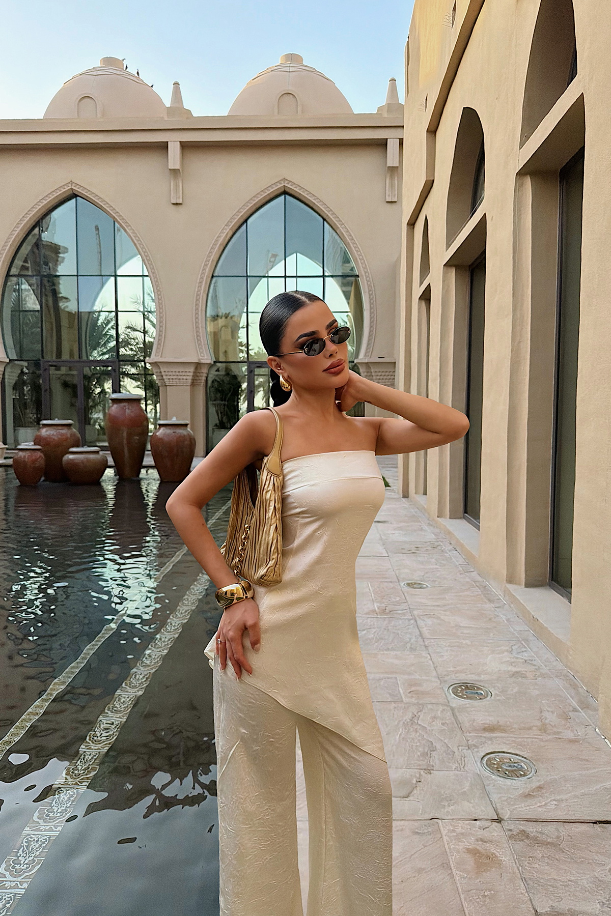 Minimal ve güçlü tasarımıyla öne çıkan bu straplez takım, üst ve pantolon uyumuyla modern bir siluet sunar. Straplez bluz formu omuz hattını zarifçe vurgularken, düz ve temiz kesimi sayesinde sade ama etkileyici bir görünüm oluşturur. Yüksek bel geniş paça pantolon ise akıcı yapısıyla hem konfor hem de uzun ve dengeli bir siluet sağlar.