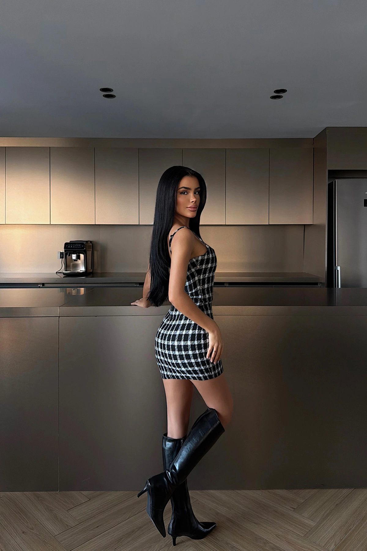 Askılı tasarımı ve vücuda oturan formuyla öne çıkan mini elbise, ekose deseniyle modern ve feminen bir siluet sunar. Kare yaka detayı üst bedeni dengeli şekilde vurgularken, sade ve net kesimi sayesinde günlük şehir kombinlerinden şık görünümlere kadar kolayca uyum sağlar.