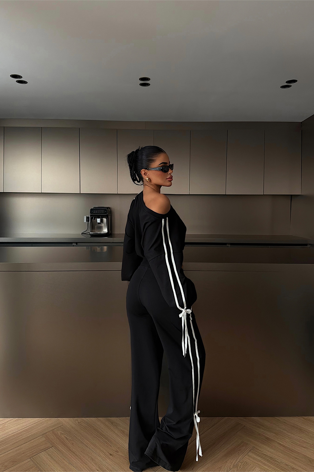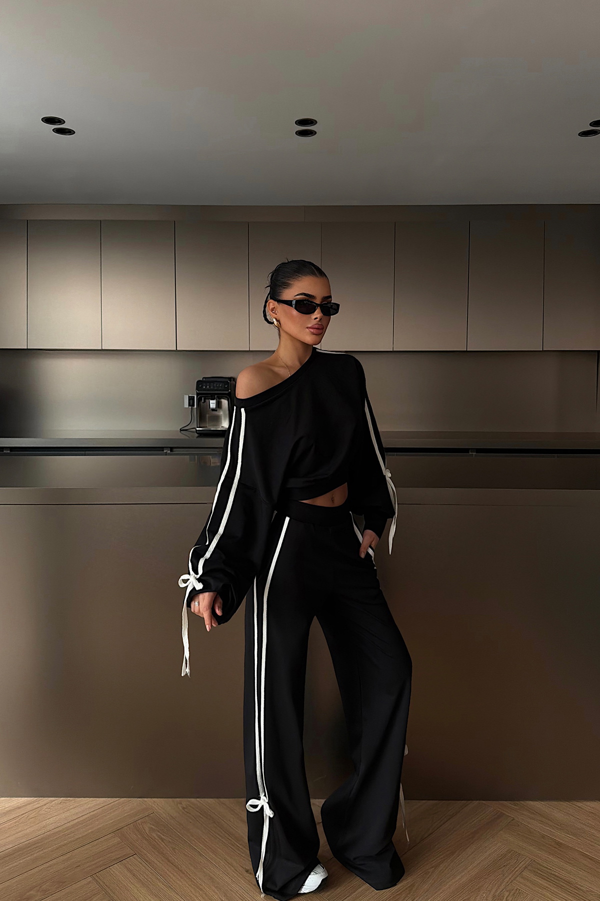 Yan şerit ve bağcık detaylarıyla öne çıkan eşofman takım, rahat kesimi sayesinde modern ve dengeli bir siluet sunar. Yumuşak dokulu örme kumaş yapısı gün boyu konfor sağlarken, pantolon paçasındaki bağcık detayı tasarıma hareket katar. Günlük kullanım ve rahat kombinler için ideal bir tercihtir.