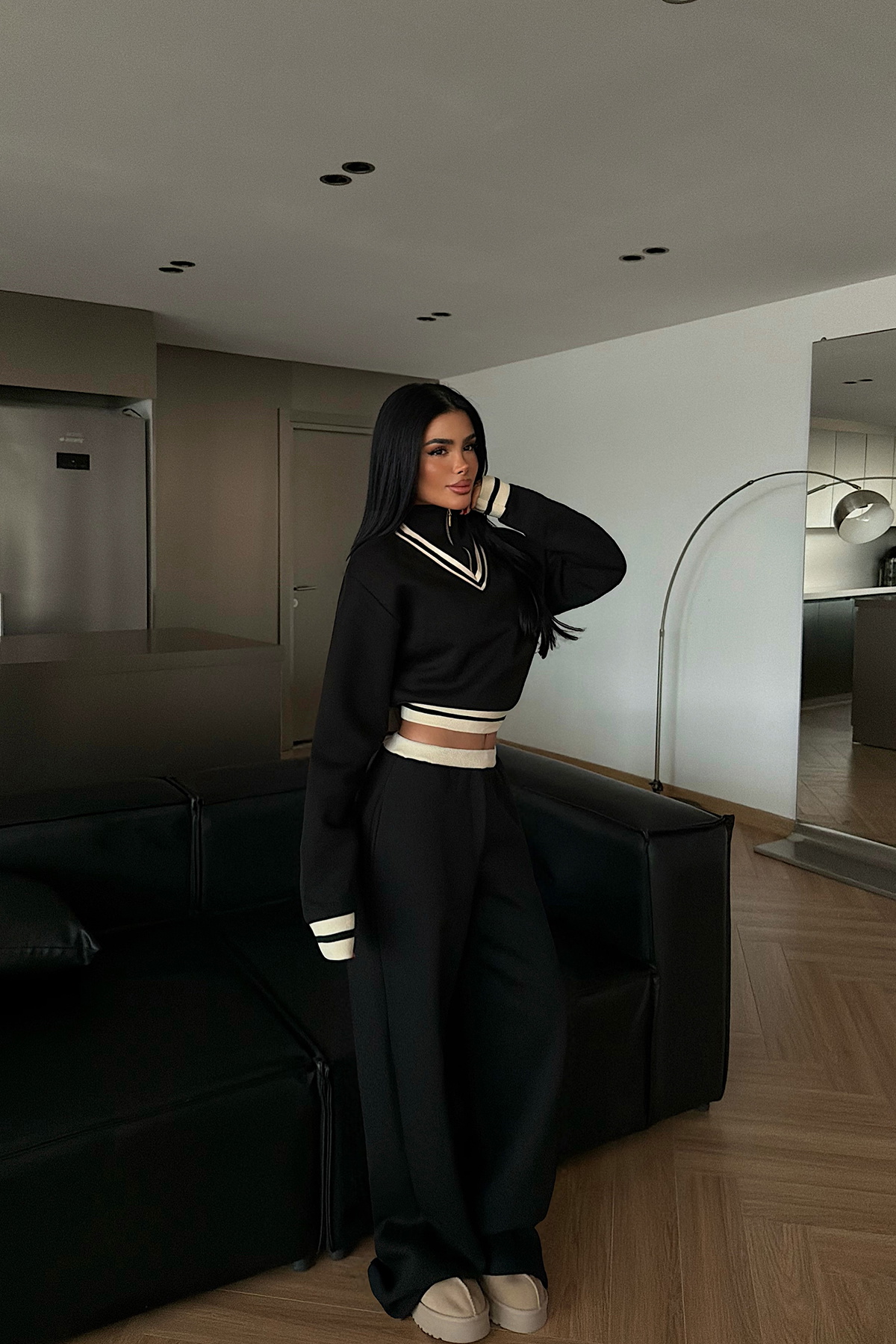 Rahat şıklığı modern detaylarla buluşturan bu eşofman takımı, yumuşak dokusu ve dökümlü duruşuyla gün boyu konfor sunar. Yaka kısmındaki sportif çizgiler, takıma zarif bir dinamizm katar. Geniş paça formu, özgür hareket imkânı sağlarken modern bir siluet oluşturur. Hem günlük stilinizi yükseltmek hem de konforlu bir görünüm elde etmek için ideal bir seçimdir.
