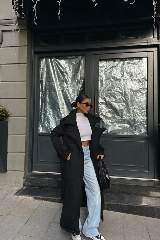 Siyah Cep Detay Uzun Kaban