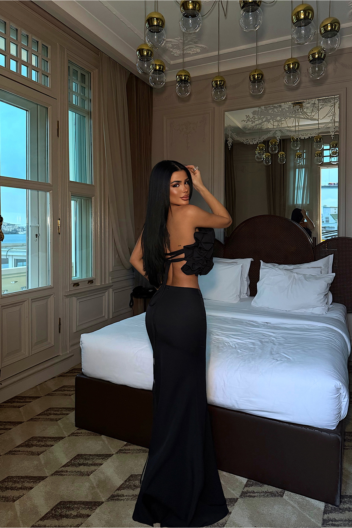 Fırfır detaylı crop üst ve yüksek bel etekten oluşan takım, heykelsi formu ve dikkat çekici tasarımıyla güçlü bir siluet sunar. Doku ve hacim kazandıran üst parça iddialı bir görünüm yaratırken, sade etek tasarımı takımı dengeler. Özel davetler ve şık kombinler için modern ve çarpıcı bir tercihtir.
