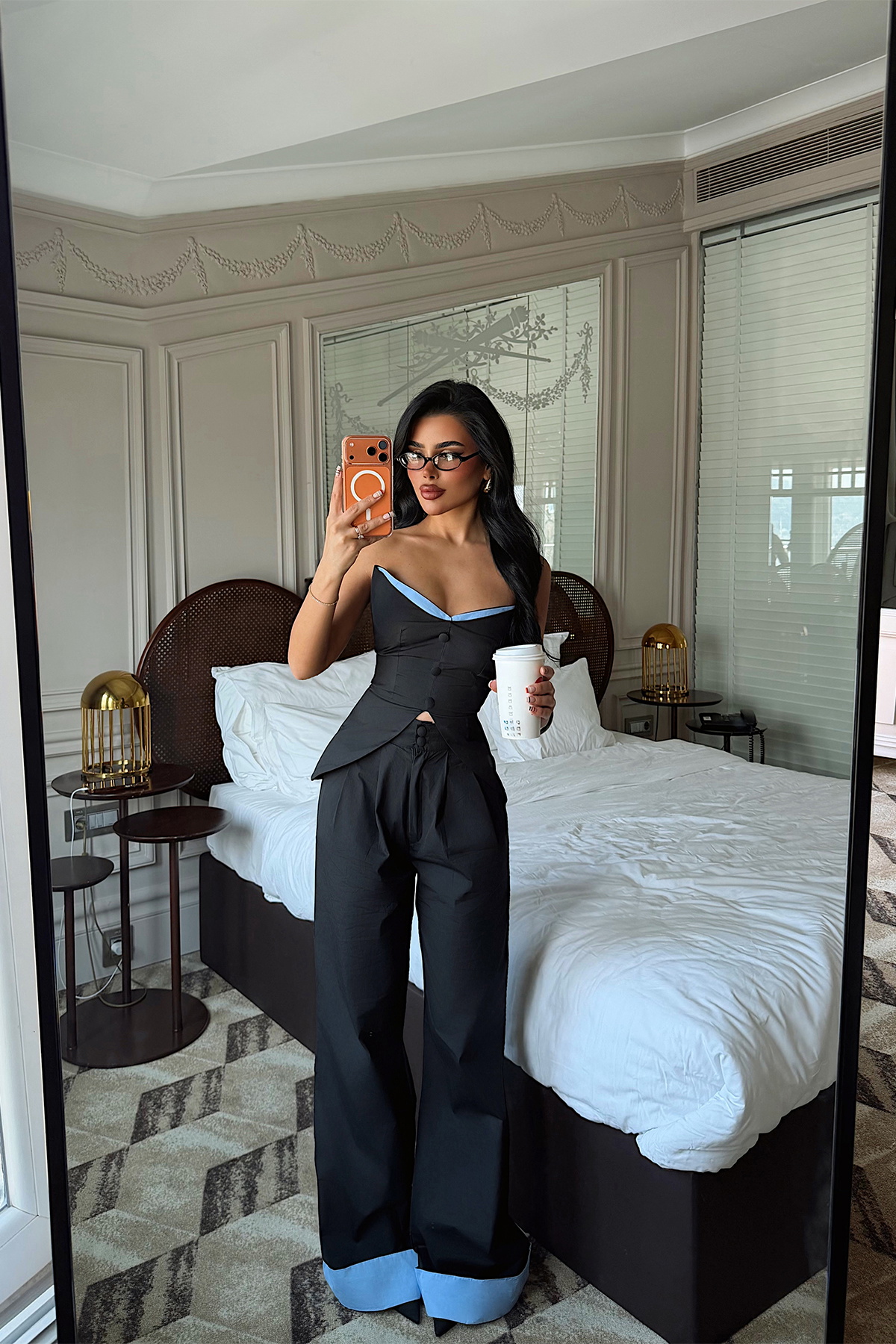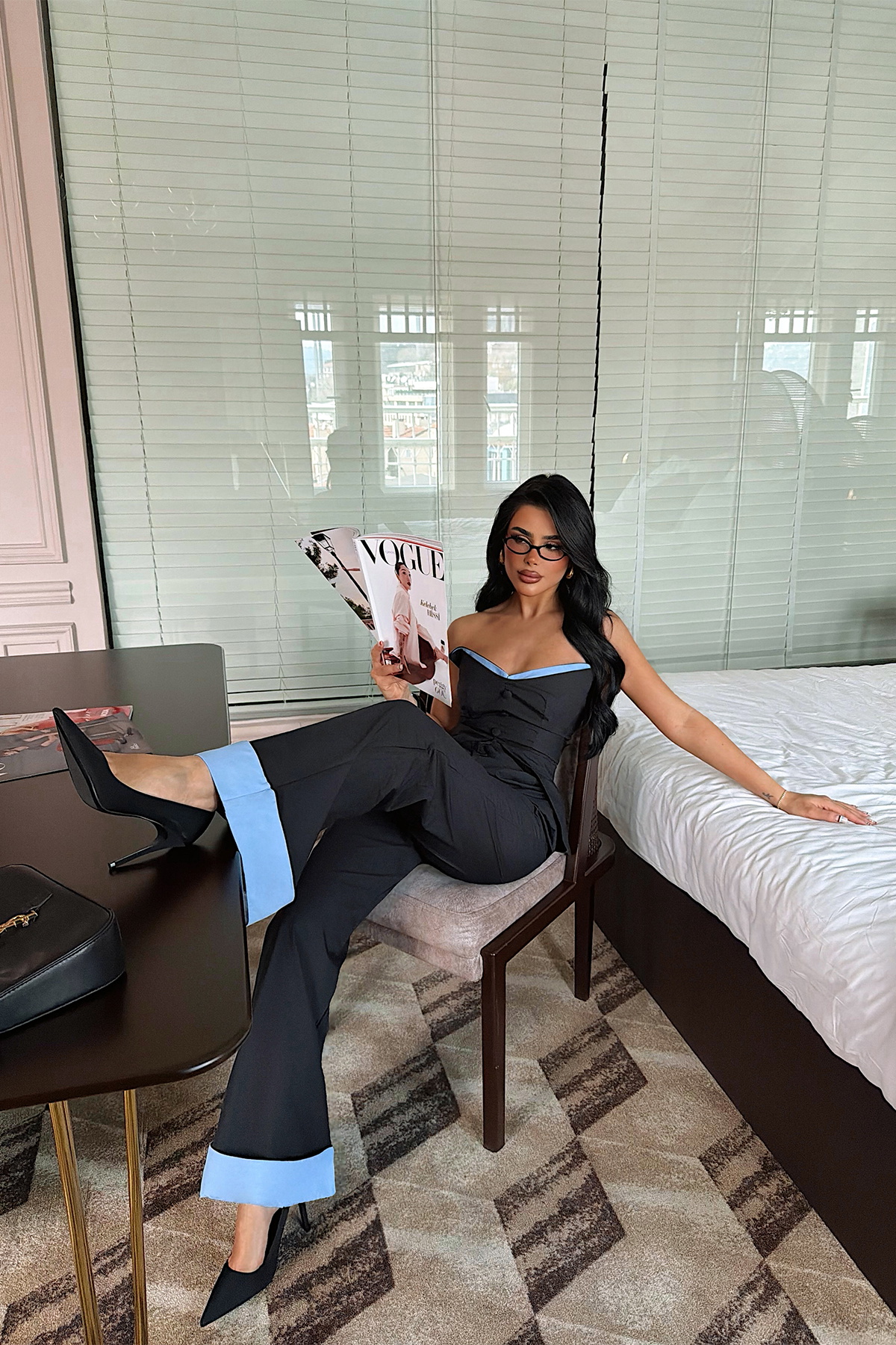 Kontrast renk detaylarıyla tasarlanan bu iki parçalı takım, modern ve iddialı bir stil sunar. Straplez büstiyer formu omuz hattını zarif şekilde vurgularken, ön kısmındaki kesim detayı tasarıma hareket kazandırır. Yüksek bel geniş paça pantolon ise rahat kalıbıyla dengeli ve uzun bir siluet oluşturur.