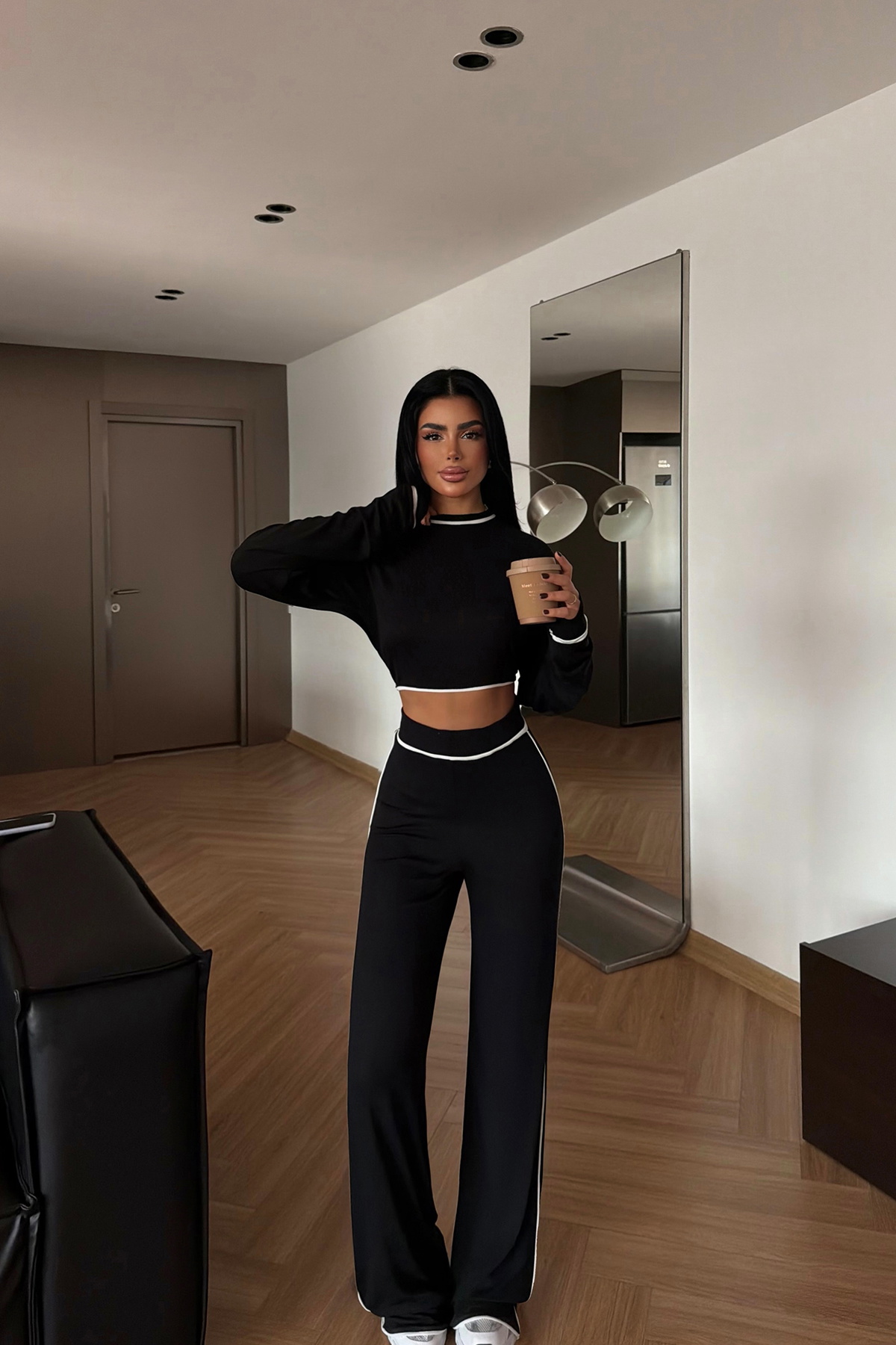 Siyah tonlarından oluşan bu crop takım, üst kısmının biraz kısa kesimi sayesinde bel hattını vurguluyor. Düz ve sade bir alt parça ile tamamlanan model, minimalist ama dikkat çekici bir tarz sunuyor.