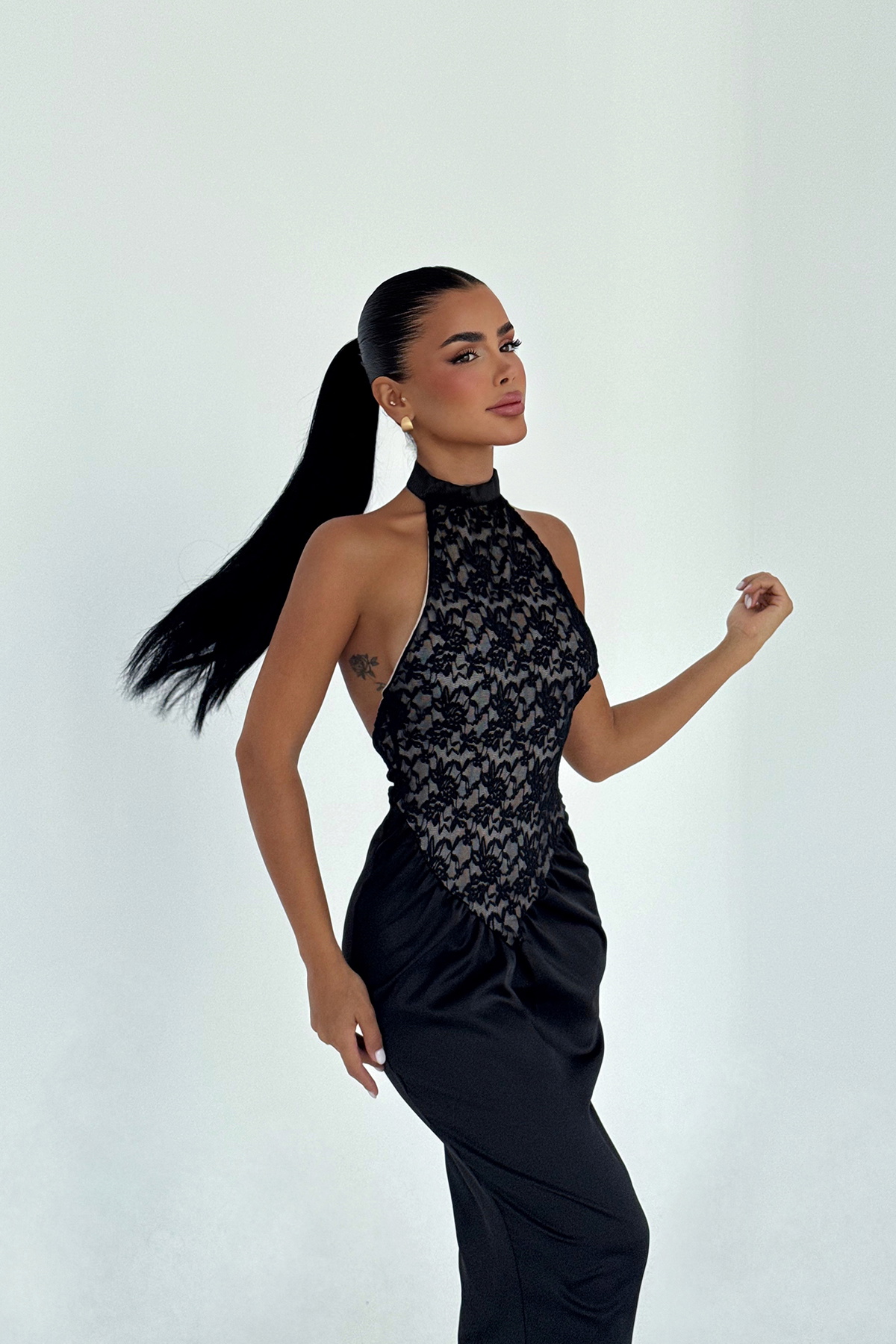Siyah Marlo Dantel Detaylı Saten Elbise – Zarif ve Feminen Tasarım