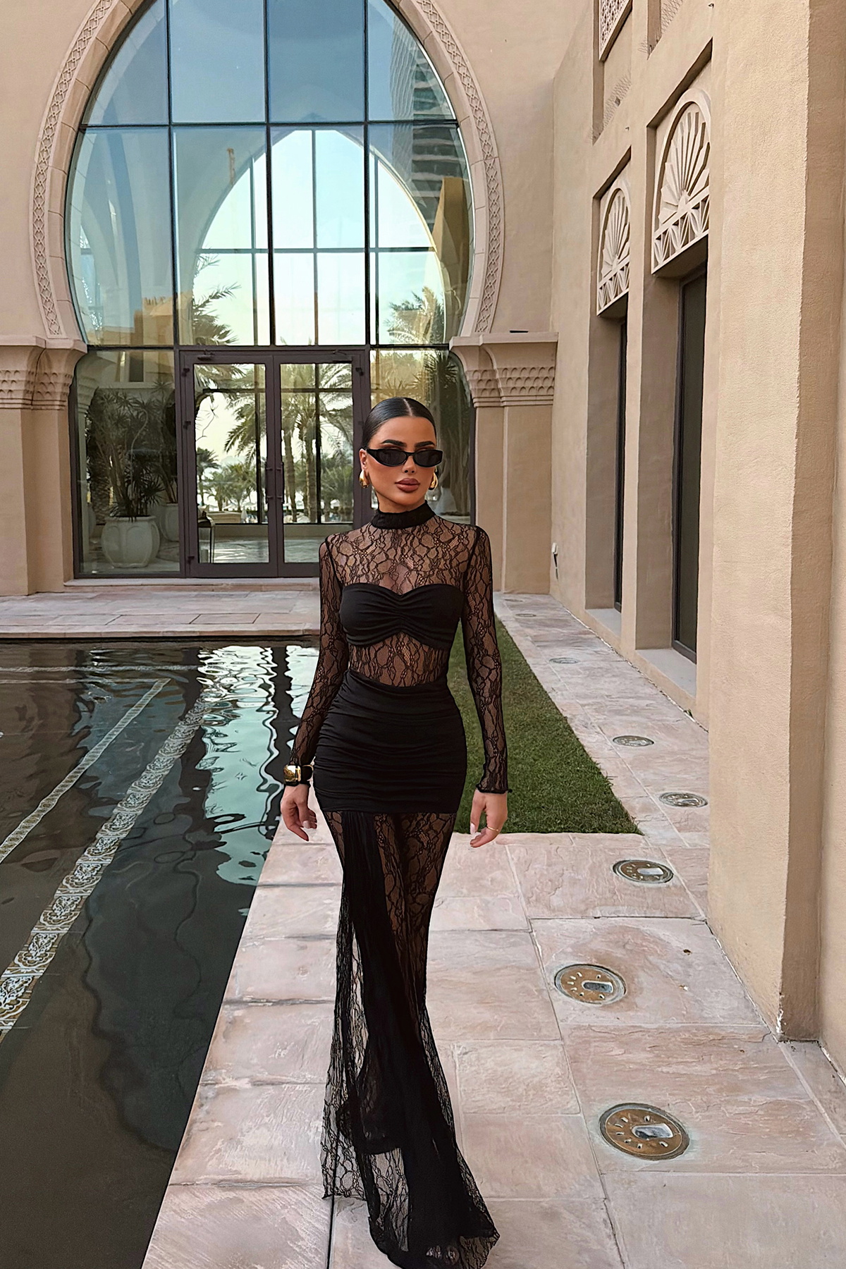 Zarif dantel dokusu ve vücuda oturan formuyla tasarlanan bu uzun tulum, iddialı şıklığı modern bir çizgide sunar. Yüksek yaka ve uzun kol detayı üst bedeni zarif şekilde vurgularken, transparan dantel yapısı tuluma sofistike bir görünüm kazandırır. Alt kısmındaki uzun ve akıcı kesim, boyu daha uzun gösteren dengeli bir siluet oluşturur.