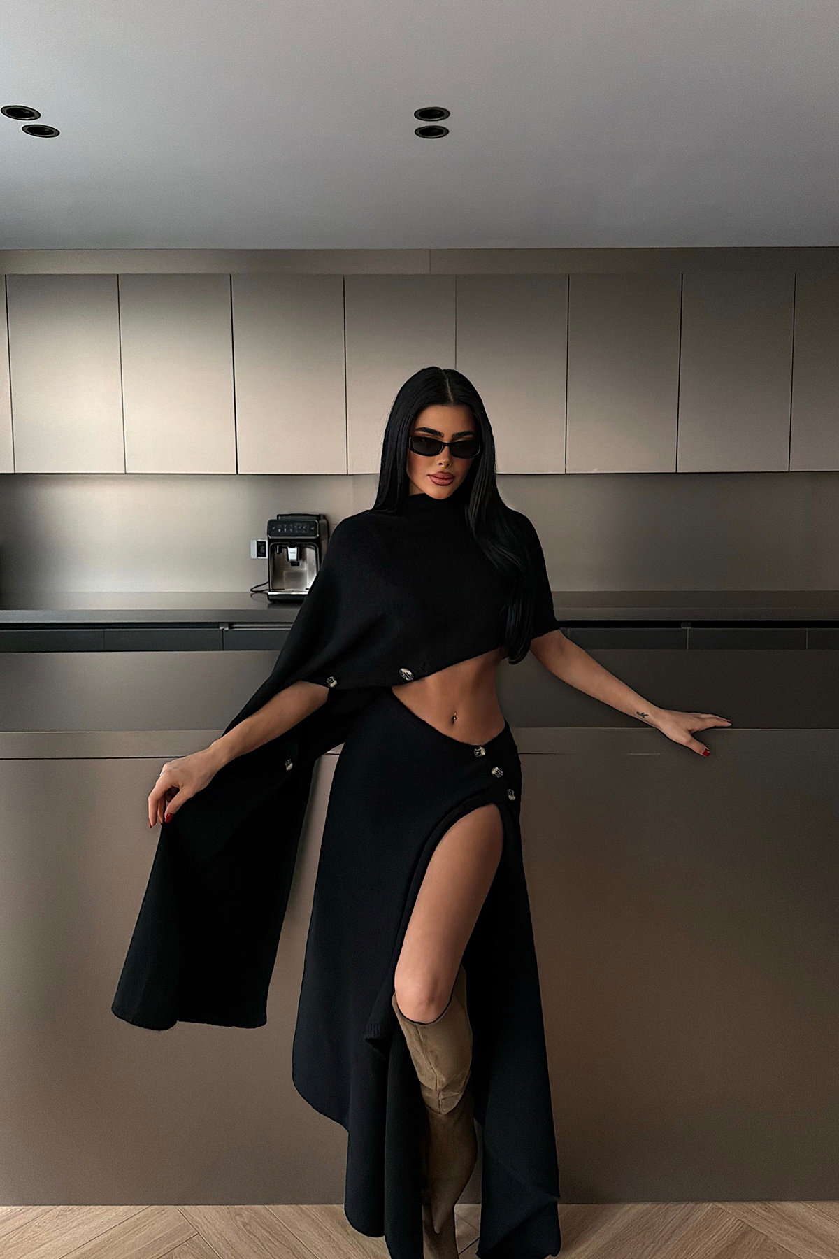 Bu takım; siyah renginde, yumuşak dökümlü kumaştan oluşan modern iki parçalı bir settir. Asimetrik kesimi ve kısa formuyla minimal ama dikkat çekici bir siluet oluşturur. Alt etek ise yüksek bel, çapraz bağlama detayı ile öne çıkar. Derin yan yırtmacı, eteğe akışkan bir görünüm kazandırırken yürüyüşte hareketli bir duruş sağlar.