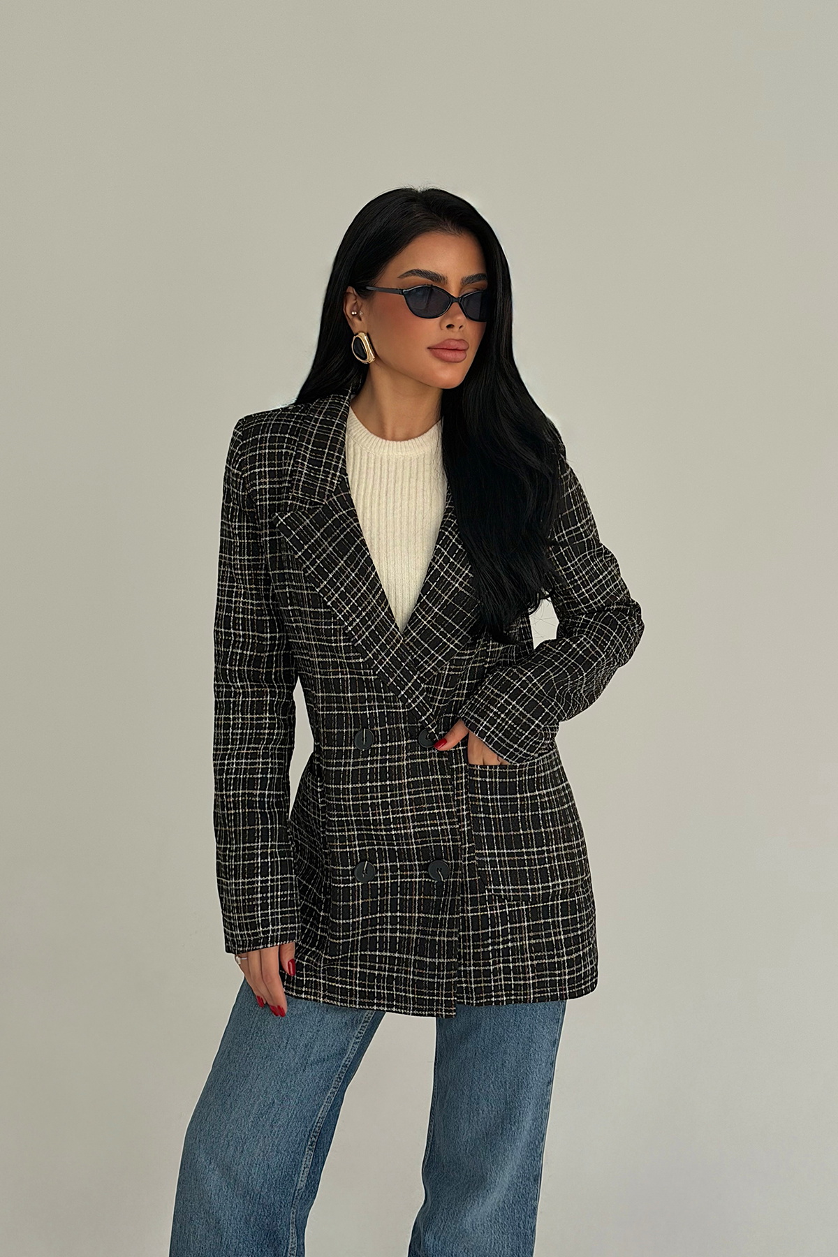 Ceket, düğme detayları sayesinde tasarıma fonksiyonel ve dikkat çekici bir hareket kazandırır. Yapısal formu ve temiz dikiş hatlarıyla öne çıkan model, düzenli kalıbı ile dengeli bir siluet sunar.