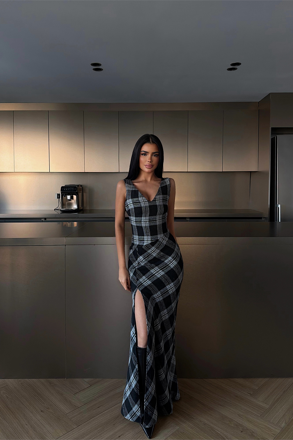 Ekose desenli yapısı ve vücuda oturan kesimiyle öne çıkan uzun elbise, ön yırtmaç detayıyla feminen ve iddialı bir siluet sunar. Kolsuz tasarımı ve akıcı etek formu, şehir stilinden özel davet kombinlerine kadar şık ve dengeli bir görünüm sağlar.