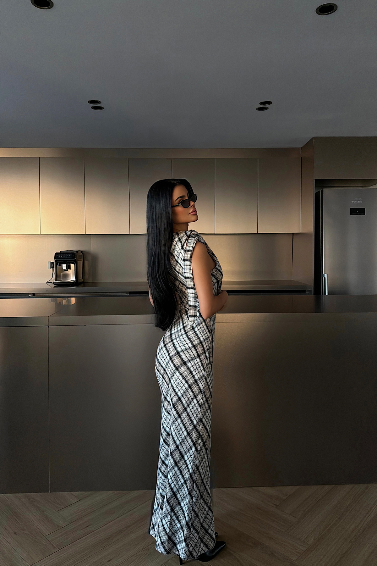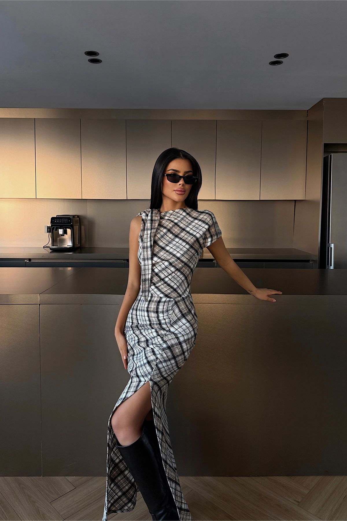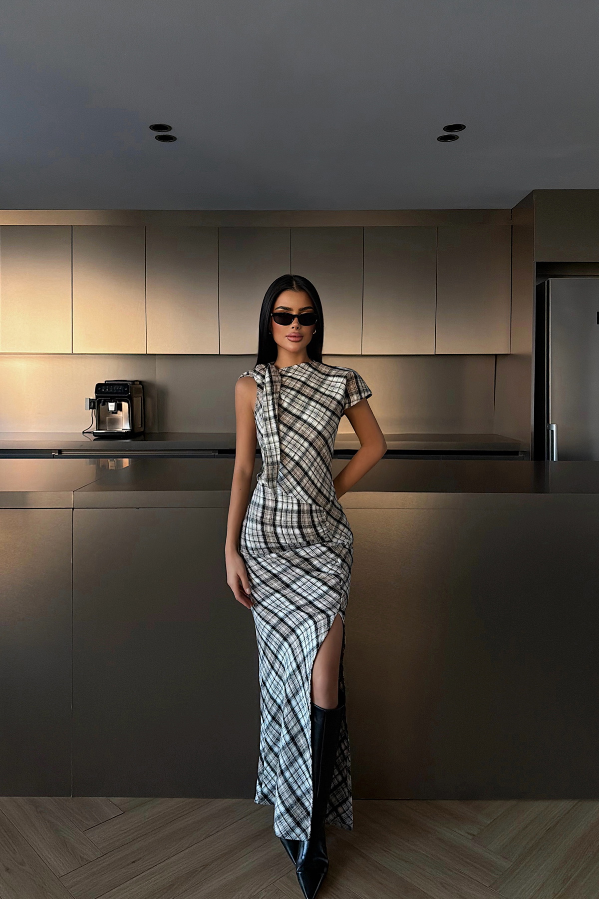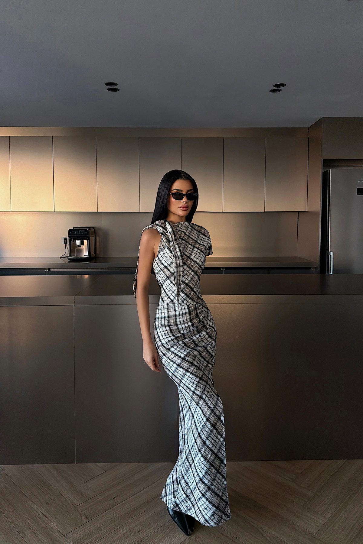 Ekose desenli yapısı ve vücuda oturan kesimiyle öne çıkan uzun elbise, kolsuz tasarımı ve ön yırtmaç detayıyla zarif ve feminen bir siluet sunar. Akıcı etek formu elbiseye hareket kazandırırken, sade ve şık duruşu sayesinde şehir stilinden özel davet kombinlerine kadar rahatlıkla tercih edilebilir.