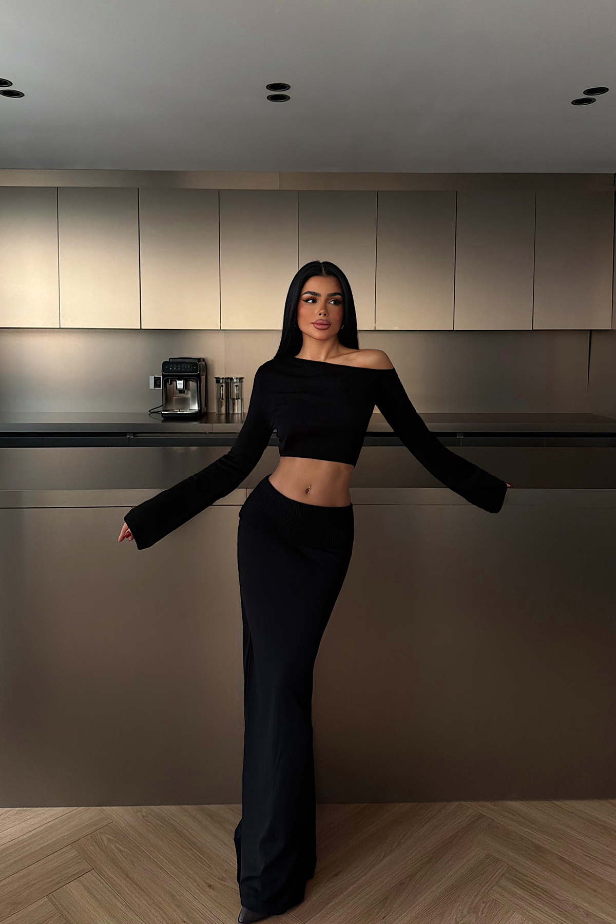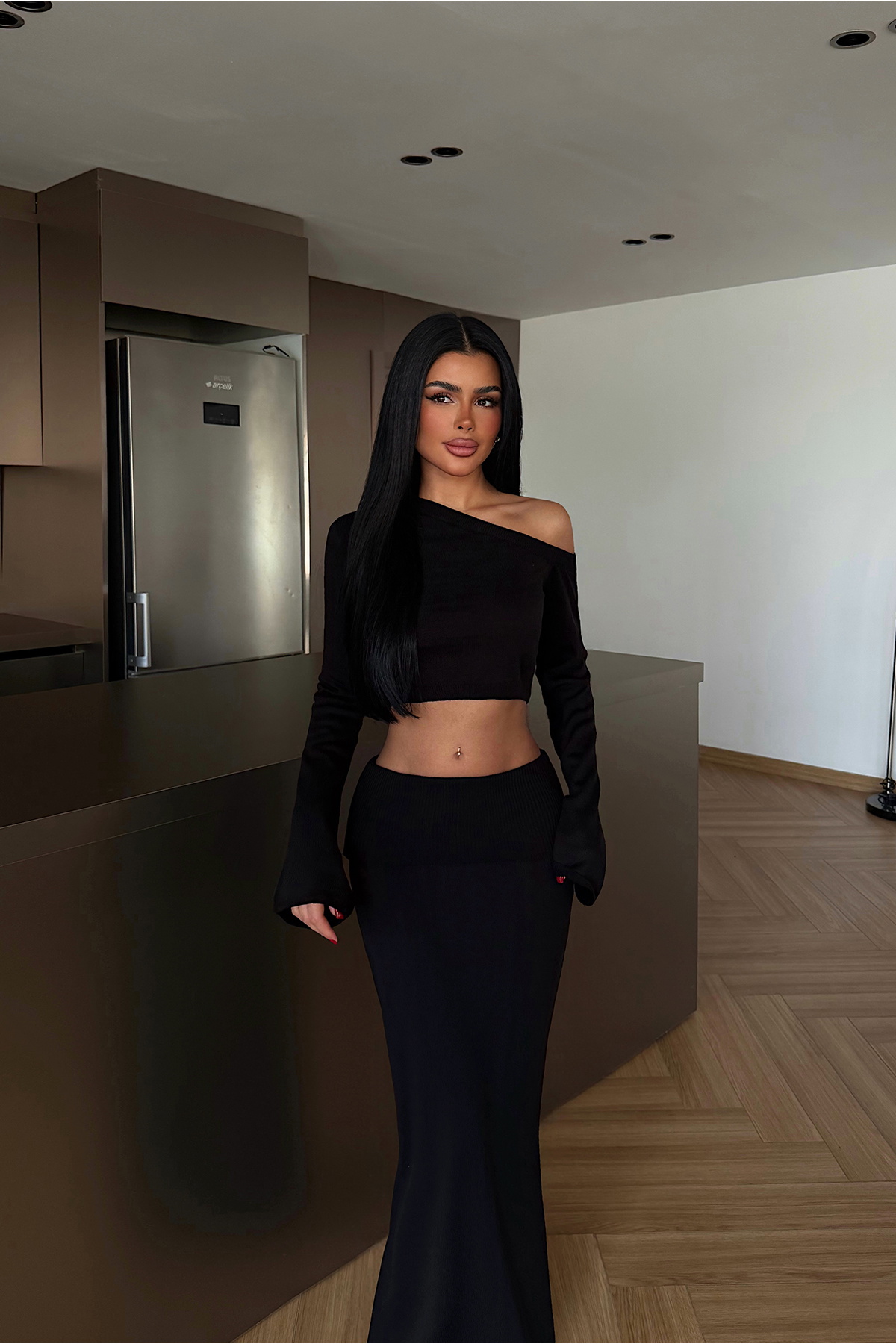 Siyah etekli triko takım yumuşak ve nötr vizon tonu ile sade, zarif bir duruş sergiler. Takım üstü sade kesim ve nötr rengiyle minimal bir görünüm sunarken, alt etek kısmı klasik bel ve paça hattına sahiptir