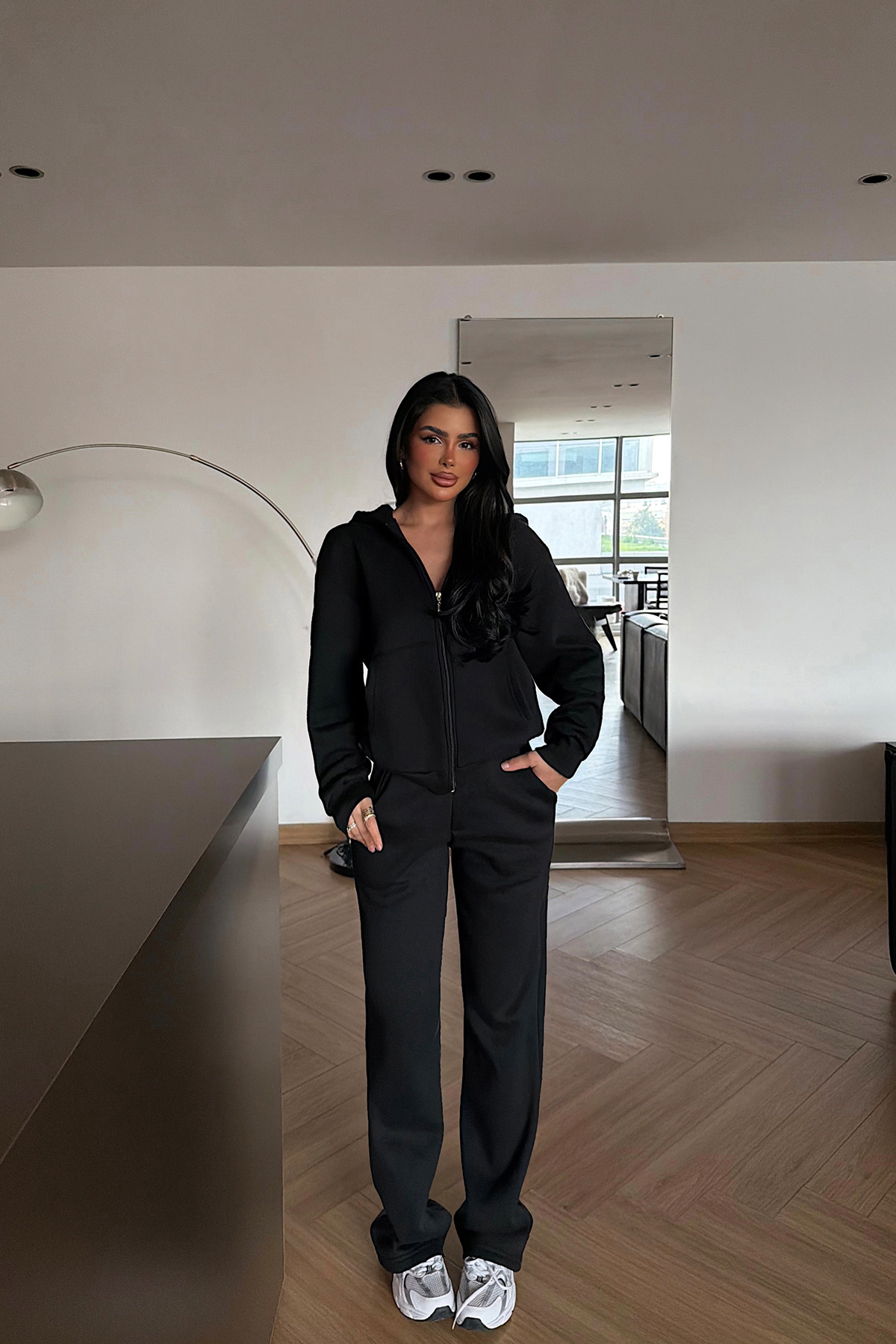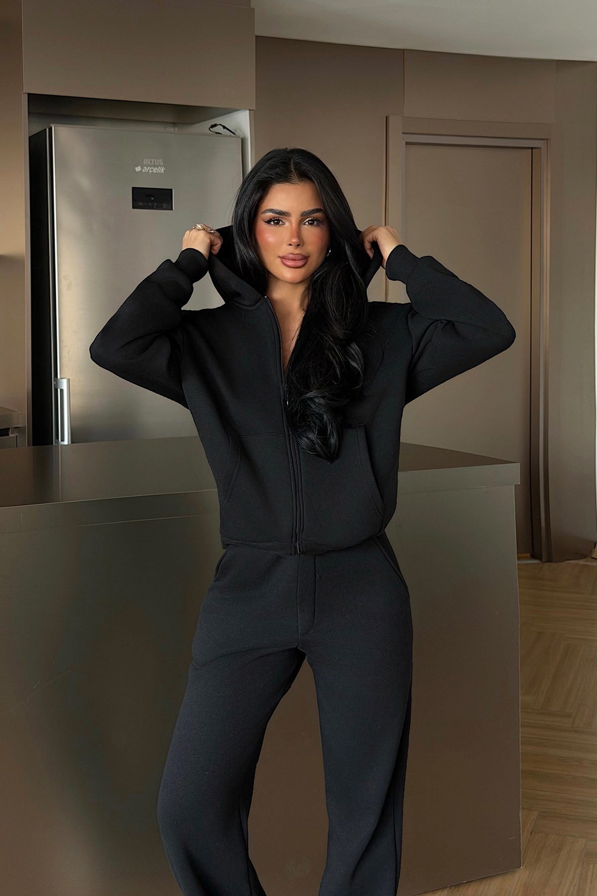 Üst parça fermuarlı formda olup yaka hattı net ve düzenli bir görünüm oluşturur. Alt parça düz paça kesimi ve akıcı duruşuyla takımı dengeler. Yumuşak dokulu kumaşı, temiz dikişleri ve rahat kalıbı sayesinde bütüncül ve konforlu bir form sağlar. Tek renk kahverengi tonu ile minimal ve zamansız bir görünüm sunar.