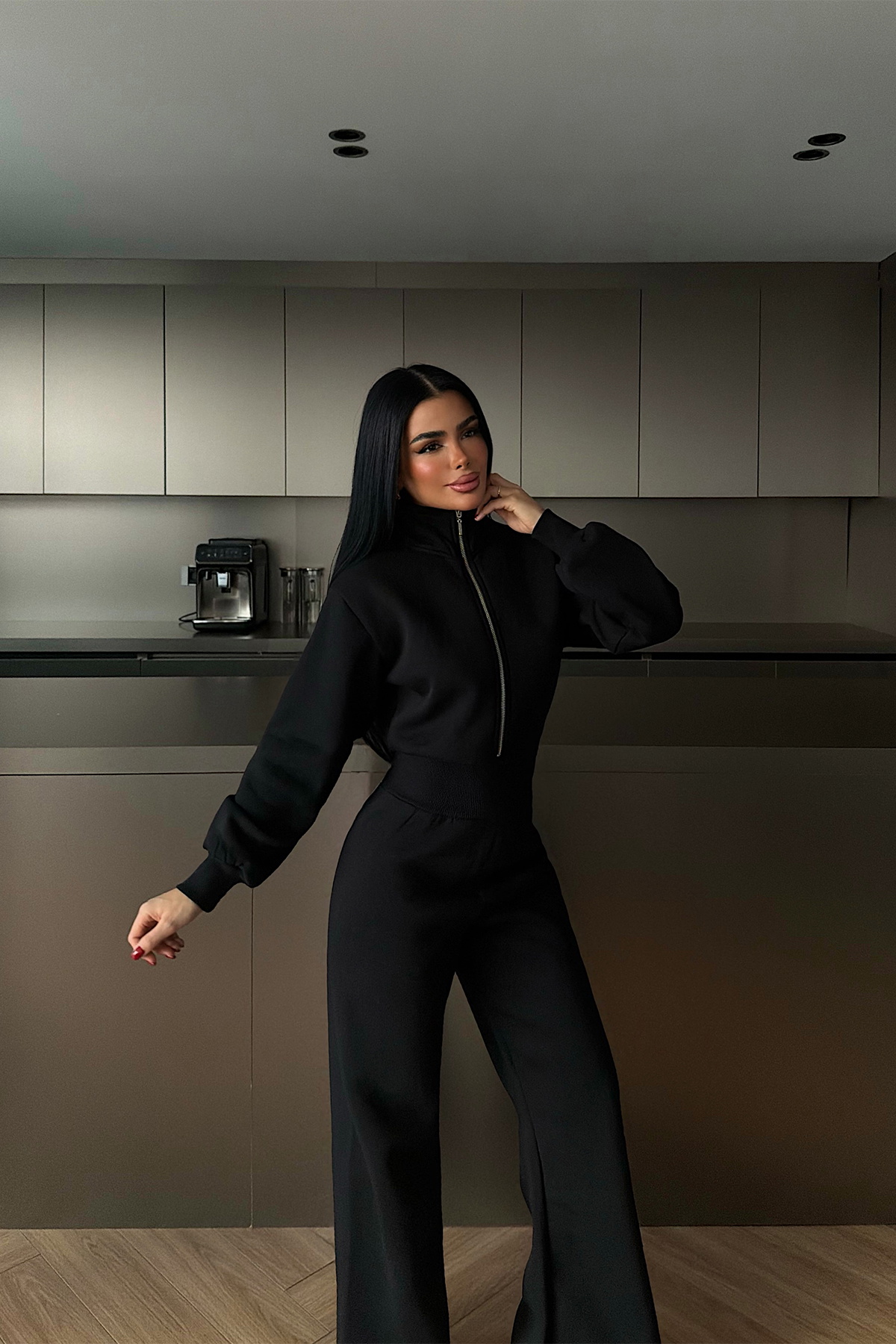Tek parça tasarımı ve fonksiyonel fermuar detayıyla modern bir duruş sunar. Üst kısmında yer alan fermuarı sayesinde giyimi kolaylaştırır ve tulumun formunu netleştirir. Siyah tonu sade ve dengeli bir görünüm oluştururken, kumaşı yumuşak dokulu ve esnektir. Düz paça kesimi ve bütüncül siluetiyle minimalist bir çizgi yakalar; dikişleri temiz, kalıbı rahattır.