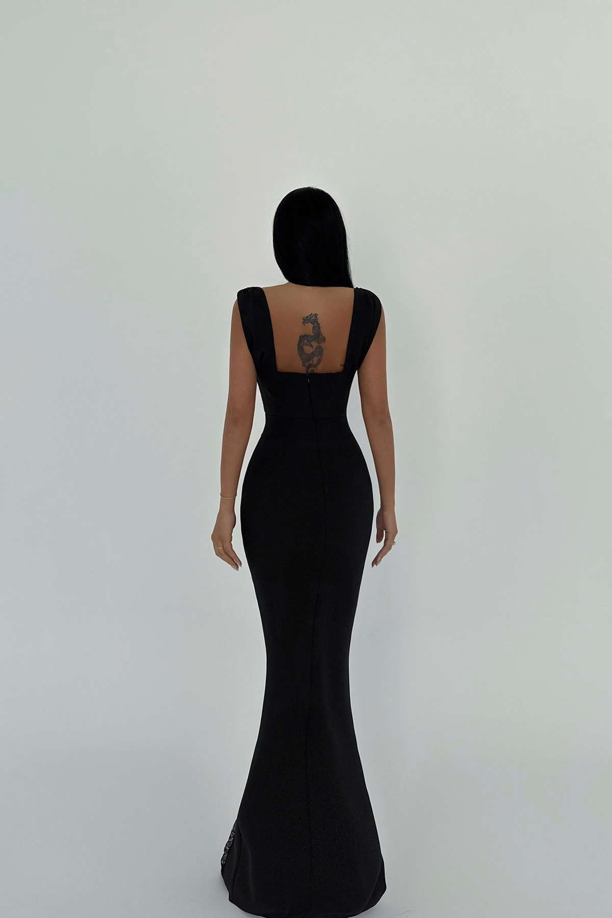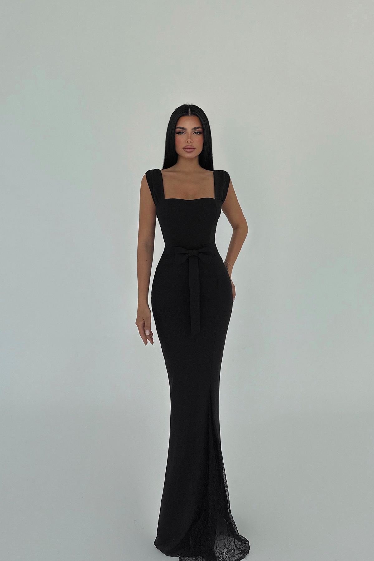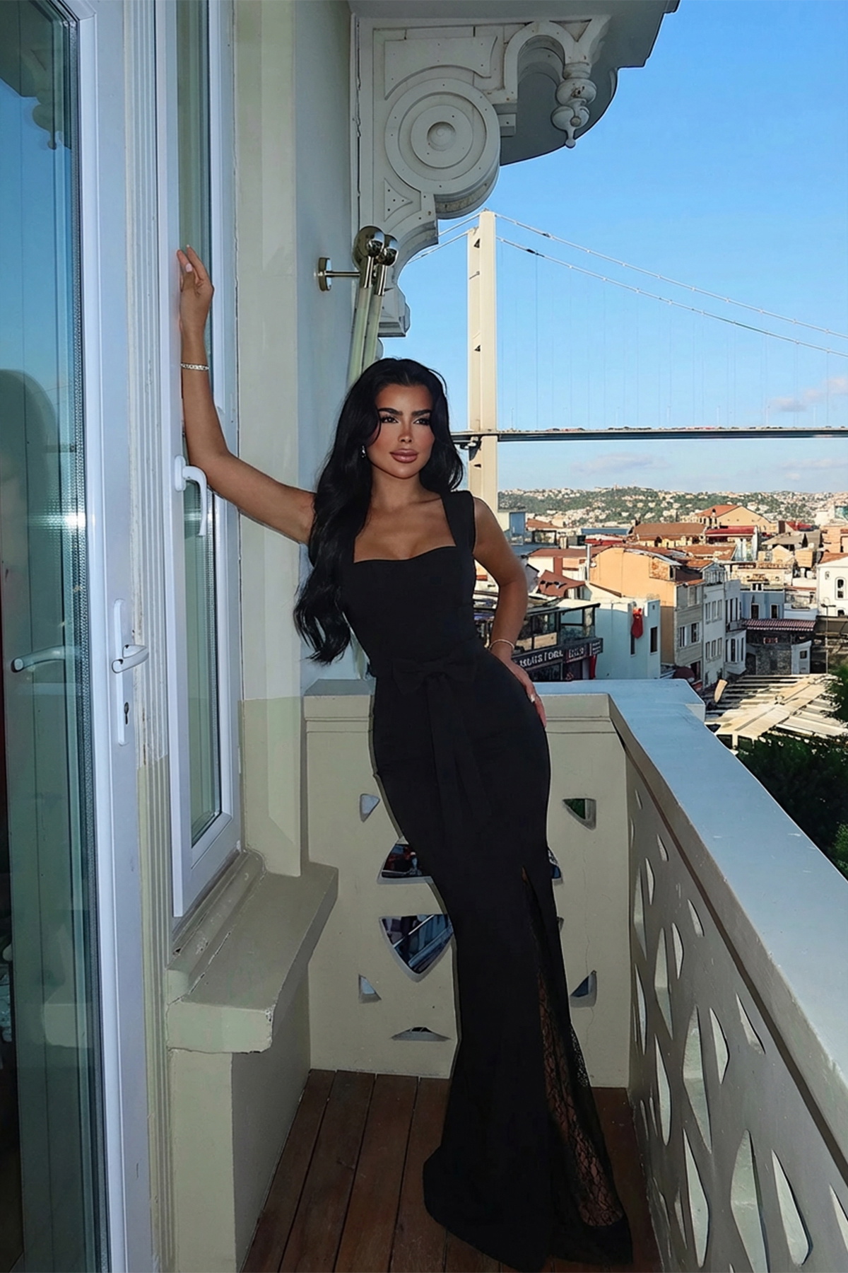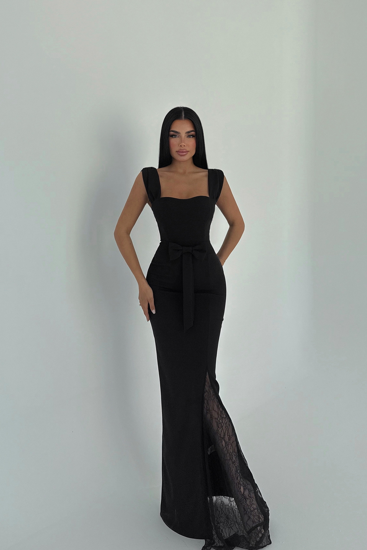 Siyah Remmy Yırtmaçlı Dantel Detaylı Uzun Elbise – Zarif ve Feminen Tasarım