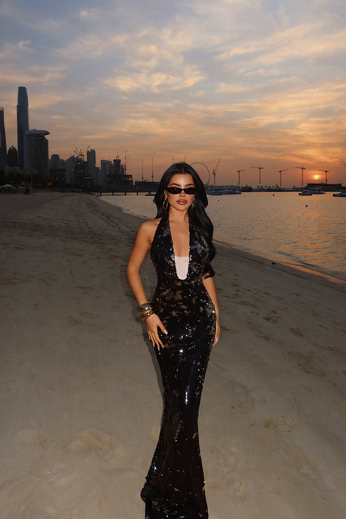 Pul payet işlemeleriyle tasarlanan bu uzun abiye elbise, gece şıklığını sofistike bir duruşla tamamlar. Derin V yaka formu feminen silueti vurgularken, vücuda oturan kalıbı boyu daha uzun ve dengeli gösteren bir görünüm sunar. Elbise boyunca yer alan pul payet detayları ışıkla birlikte zarif bir ışıltı oluşturur.