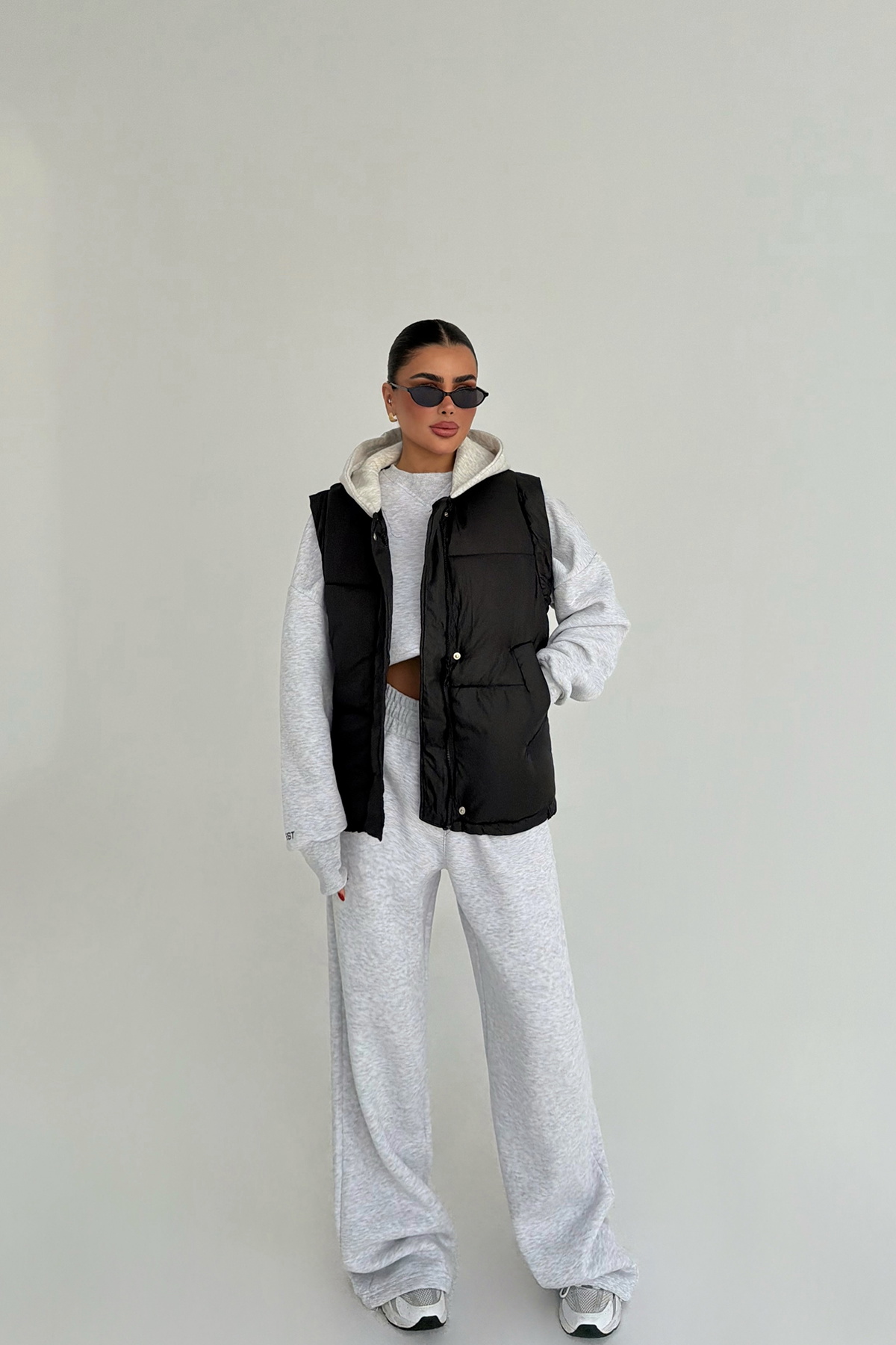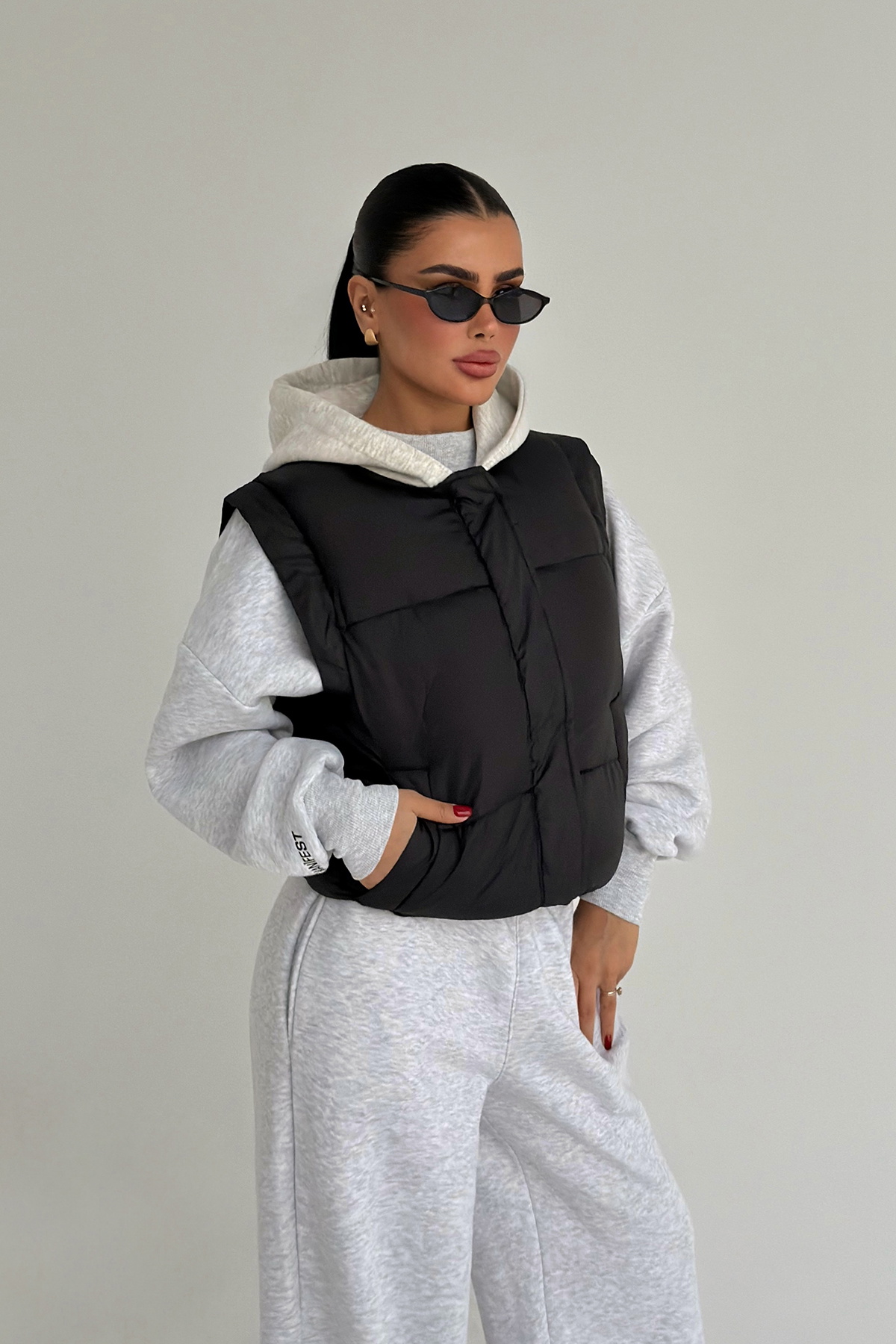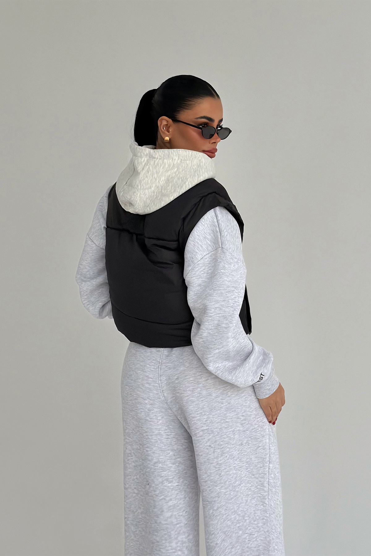 Siyah kapüşonlu yelek, sportif ve şehir şıklığını birleştiren çok yönlü bir dış giyim parçasıdır. Hafif dolgu ve rüzgar kesici kumaşı ile serin havalarda koruma sağlar, aynı zamanda vücuda oturan kesimiyle zarif bir siluet oluşturur.