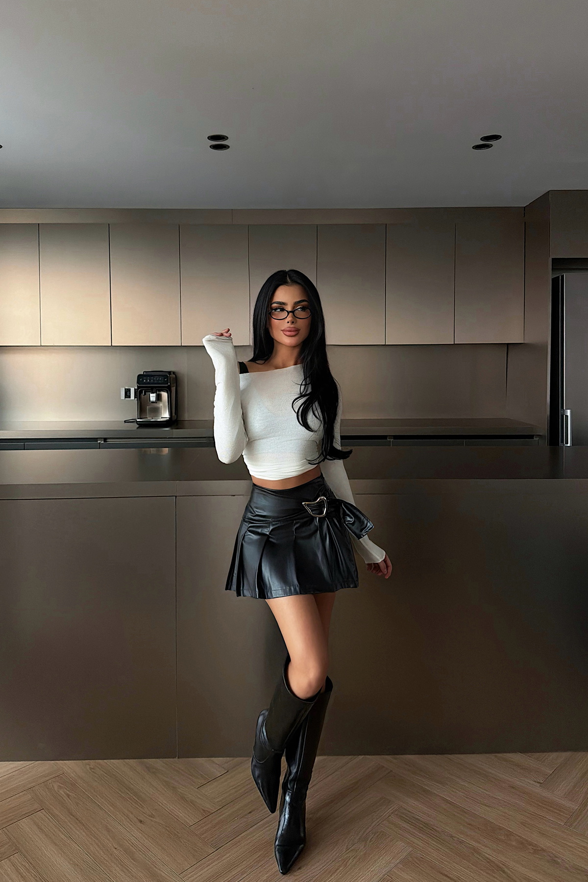 Parlak görünümlü dokusuyla dikkat çeken bu mini etek, önden kemer formundaki metal detayla stiline güçlü bir vurgu katar. Yüksek bel kesimi sayesinde vücut hatlarını zarif şekilde ön plana çıkarırken, kısa boyu modern ve iddialı bir duruş sunar.