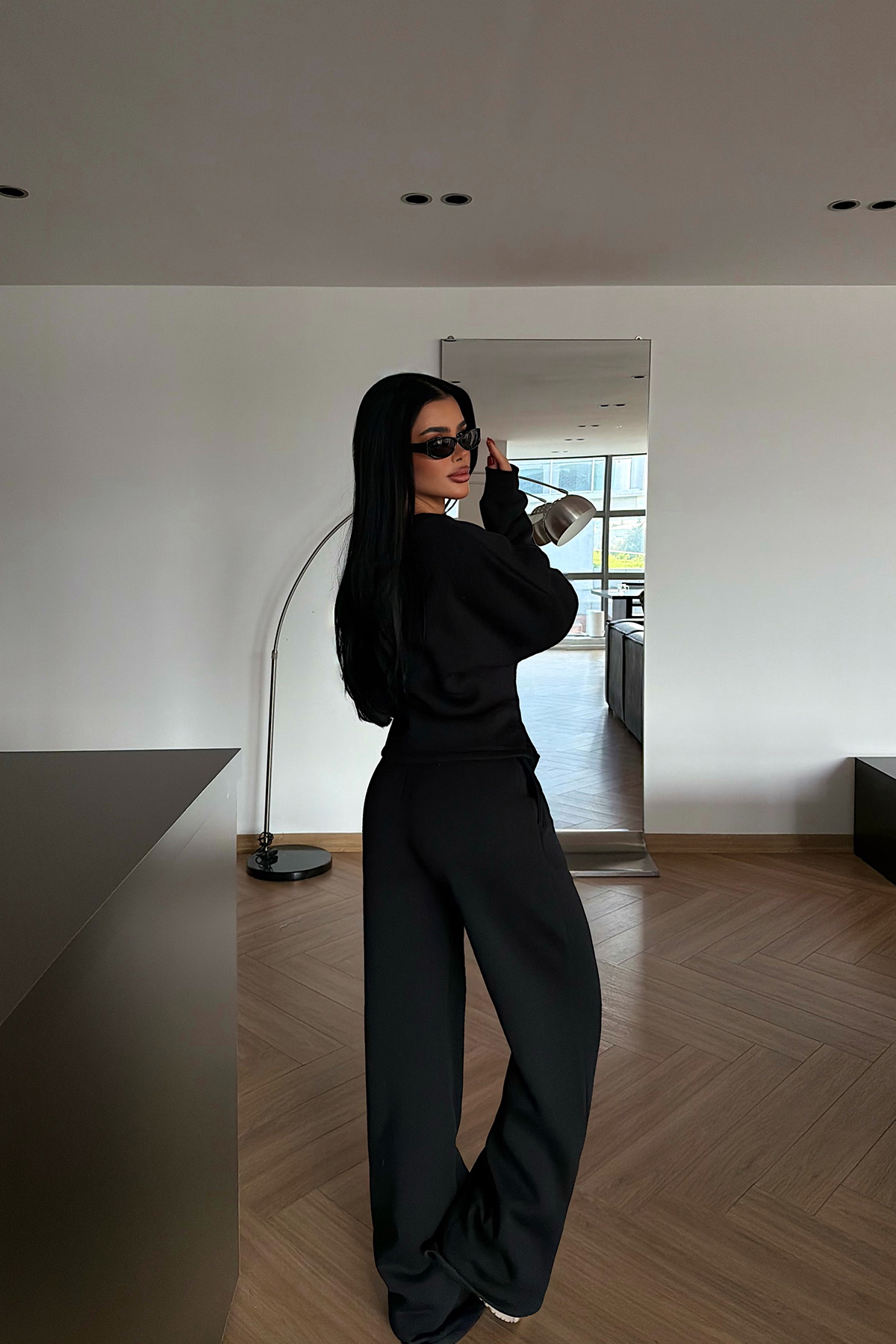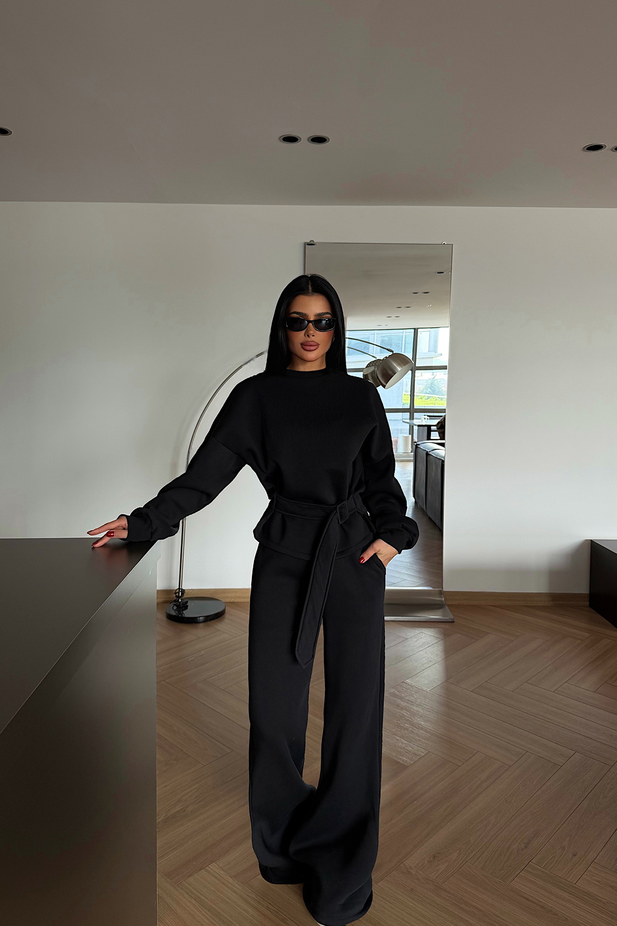 Bu zarif siyah eşofman takım kemer detayıyla öne çıkan tasarımı sayesinde hem günlük giyimde hem de özel davet ve iş ortamlarında “şık & sofistike” görünüm isteyen kadınlar için ideal.
