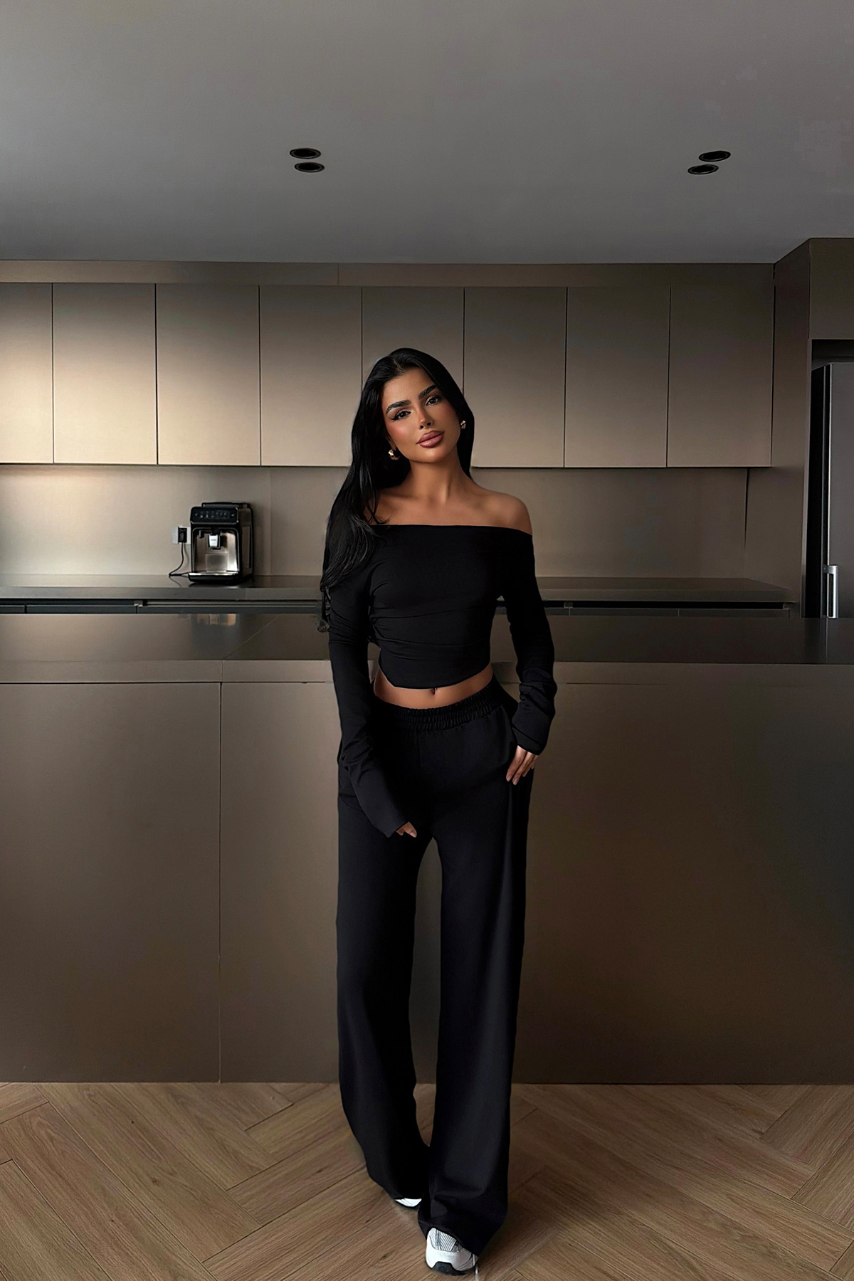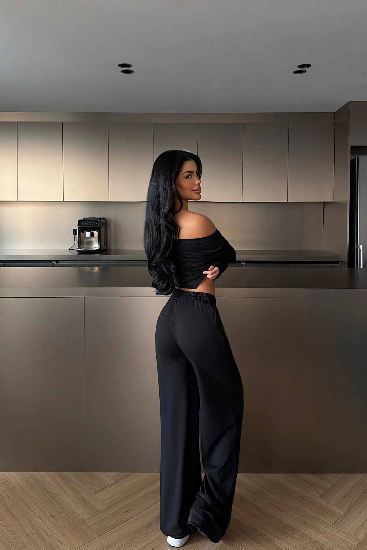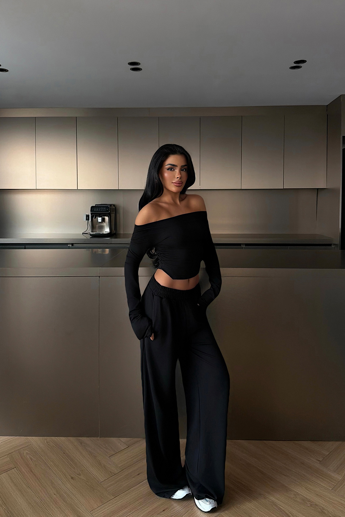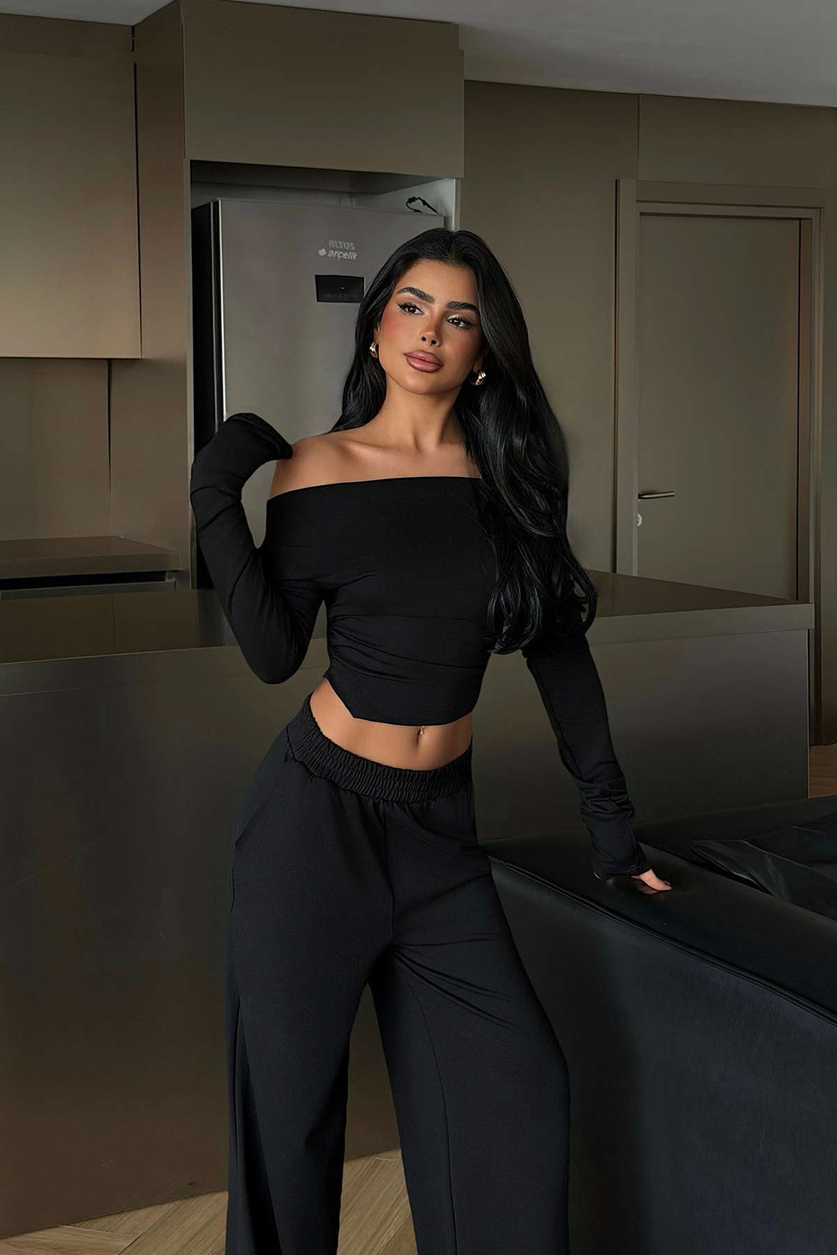 Omuzları açık bırakan asimetrik crop üst ve rahat kesim pantolondan oluşan takım, modern ve feminen bir siluet sunar. Yumuşak dokulu kumaşı konfor sağlarken, vücuda oturan üst formu ile dengeli ve şık bir görünüm oluşturur.