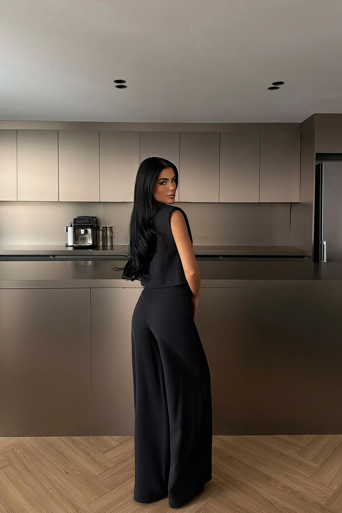 Minimal tasarıma sahip bu iki parçalı takım; kolsuz yelek formundaki üst ve geniş paça pantolondan oluşur. Akıcı duruşu sayesinde vücuda dengeli bir siluet kazandırırken, net kesimleriyle modern bir stil sunar. G