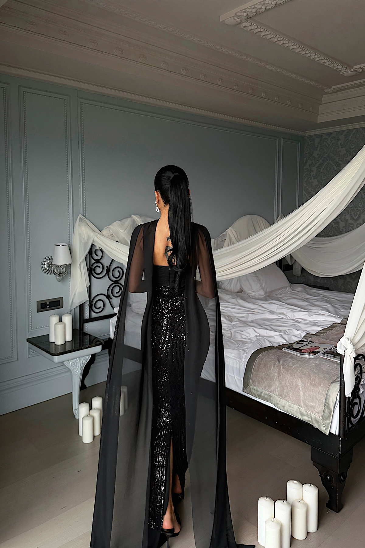 Zarif payet dokusuyla öne çıkan bu uzun elbise, vücuda oturan formuyla feminen bir siluet sunar. Omuzdan uzanan şal detayı tasarıma hareket katarken, sade üst formu payetli yüzeyle dengeli bir şıklık yaratır.