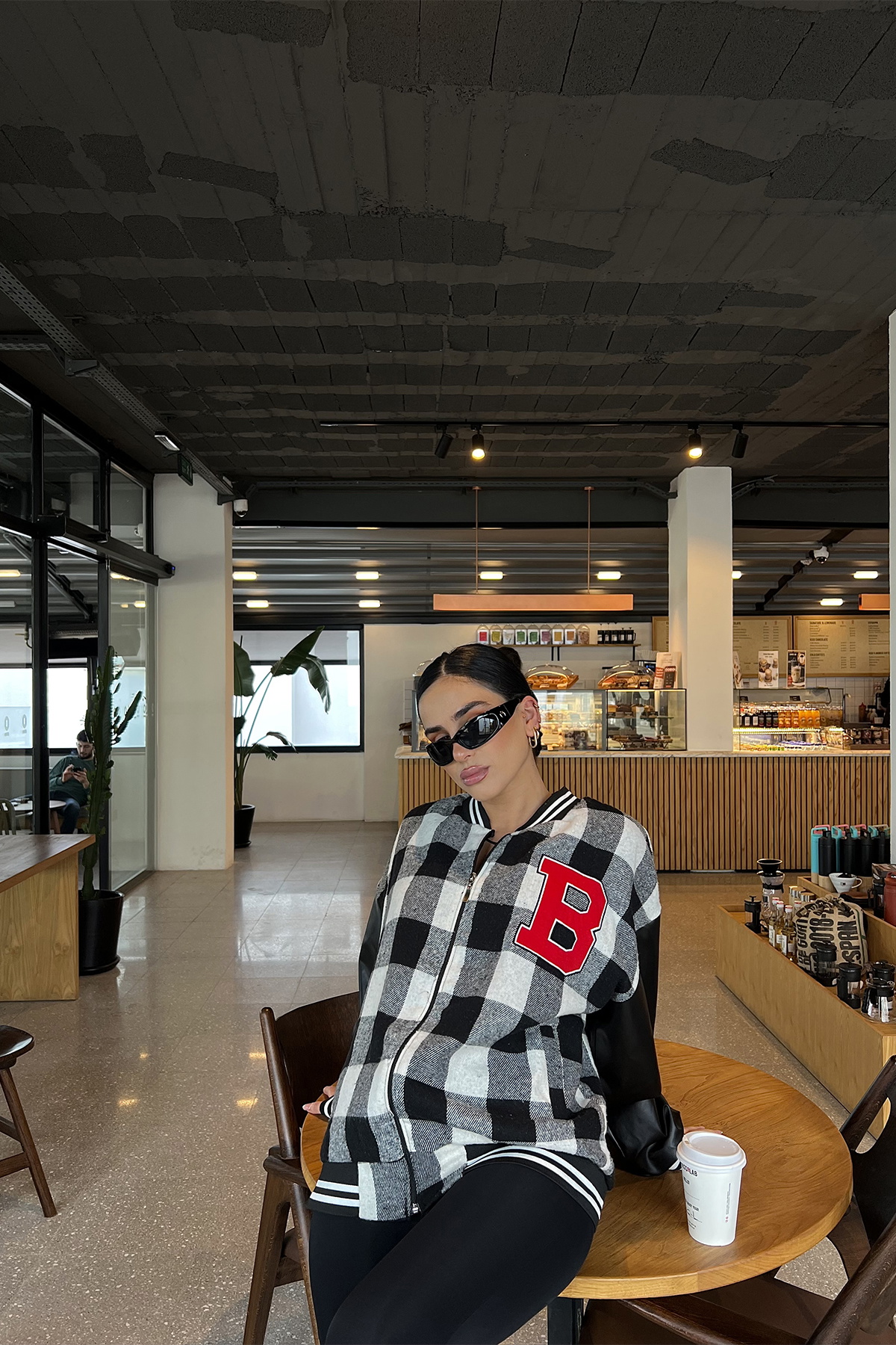 Siyah Pötikare Desen Harf Baskılı Kolej Ceket