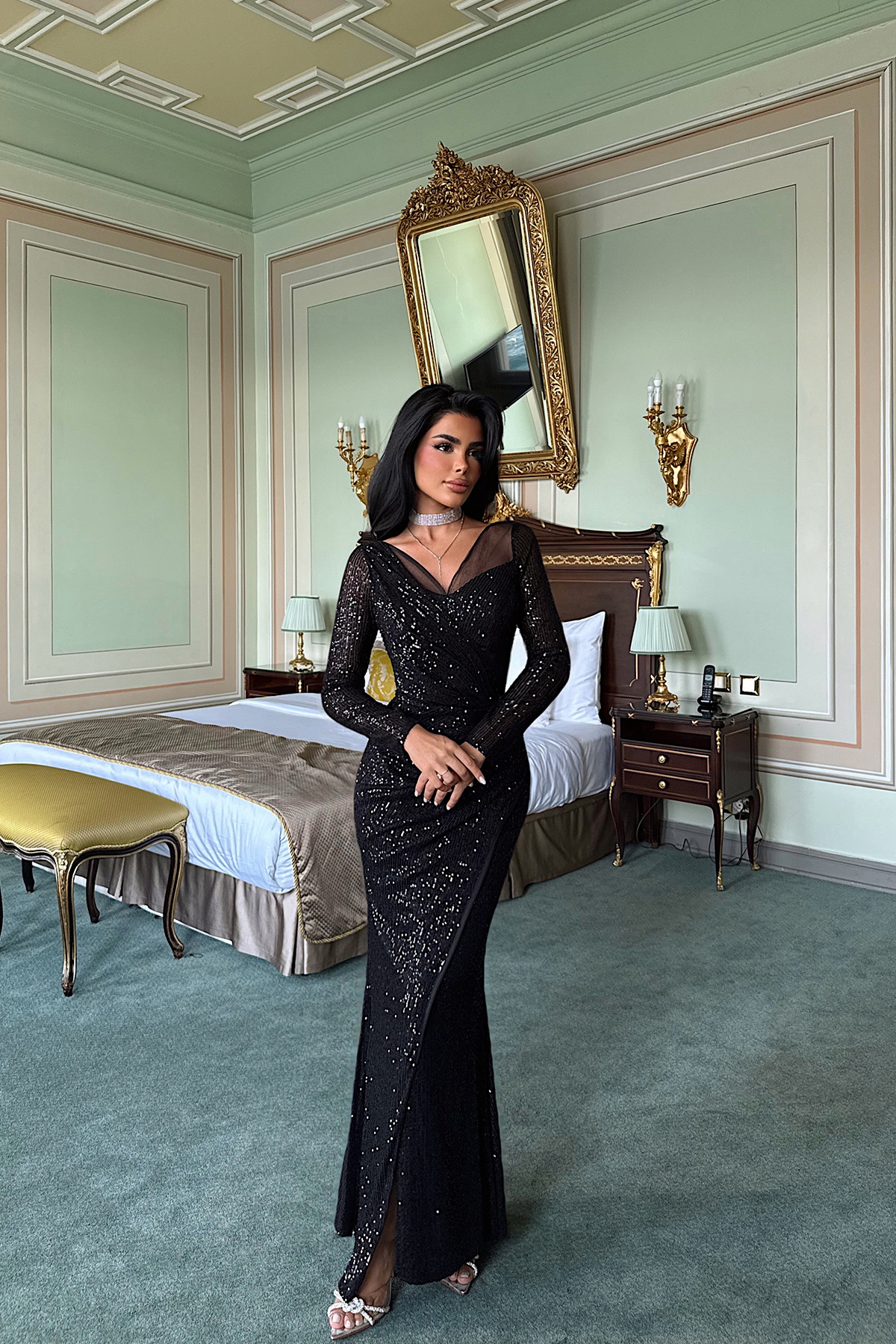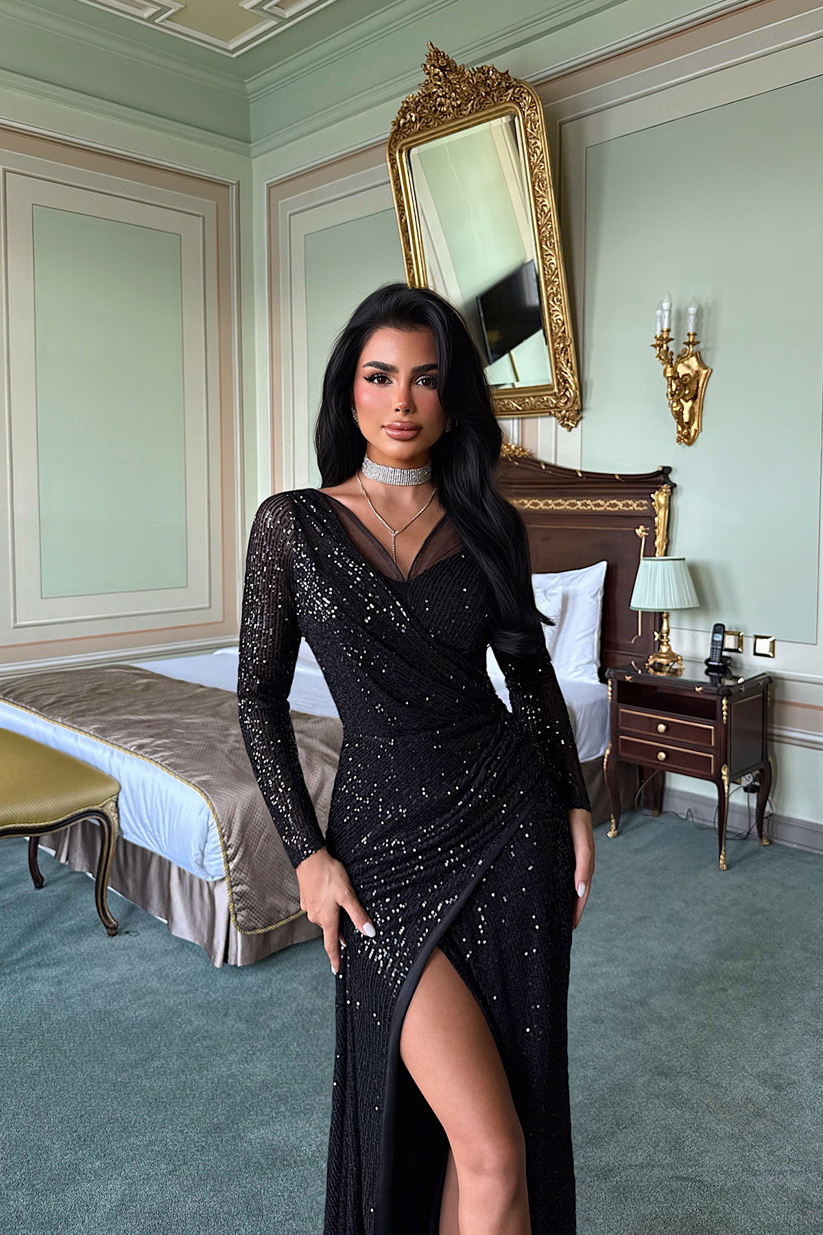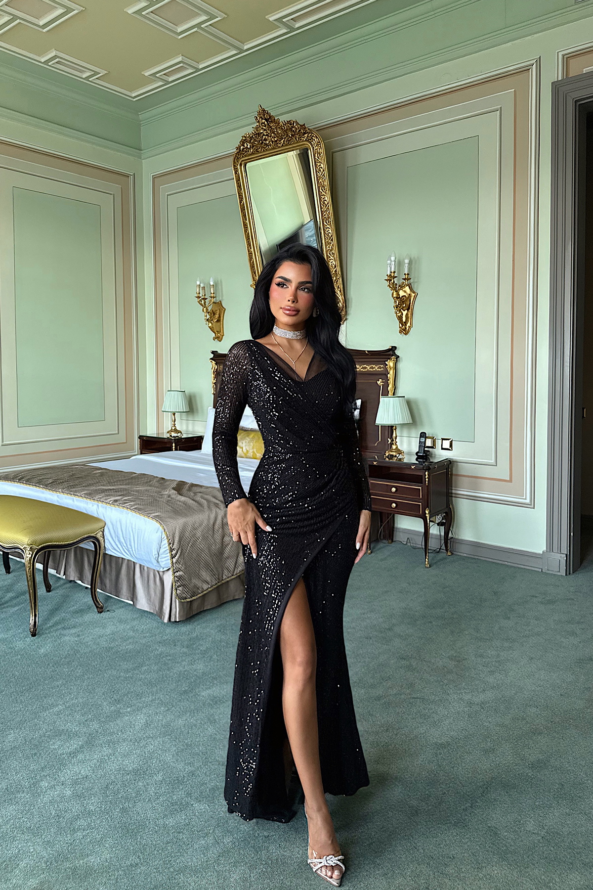 Siyah Tamera Uzun Kollu Payetli Abiye – Zarif ve Işıltılı Şıklık