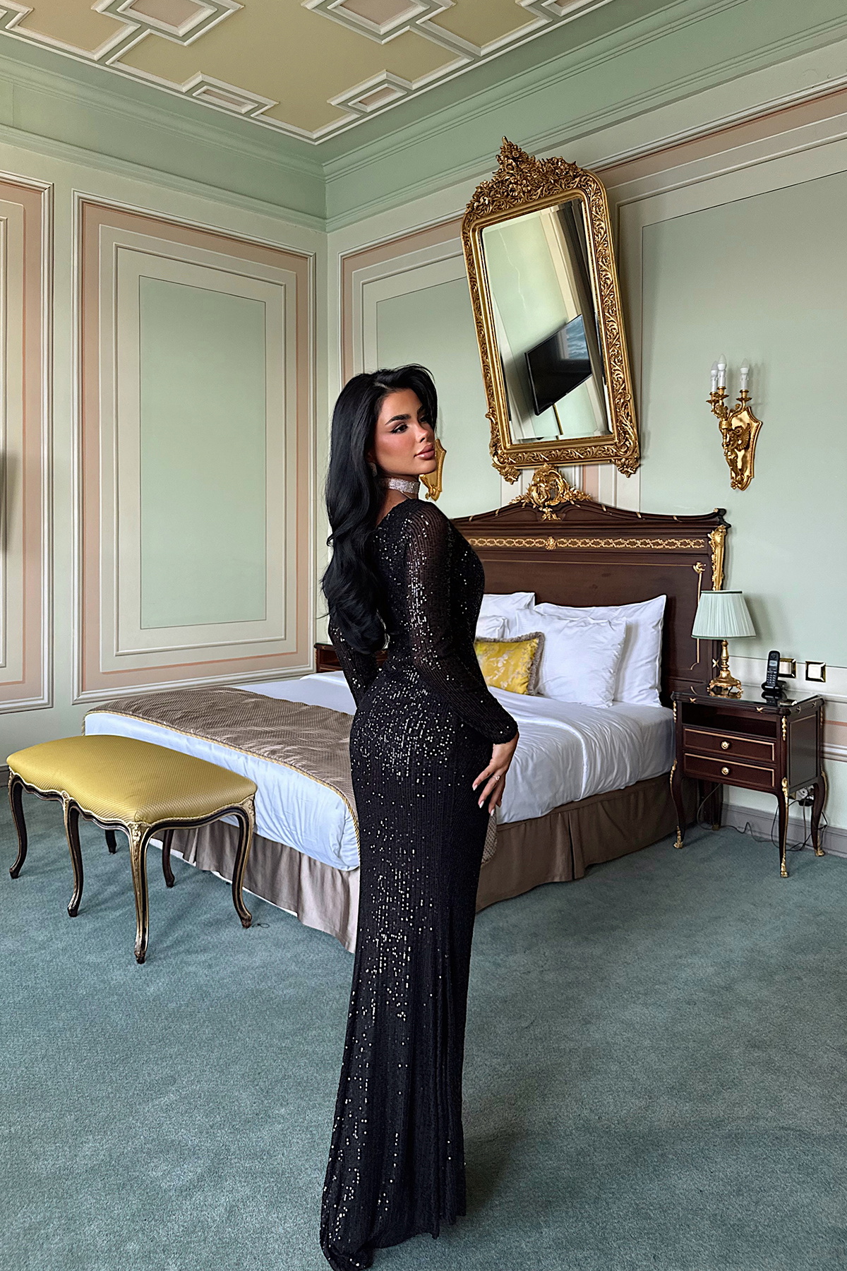 Klasik siyah rengi ve uzun kollu payet detaylarıyla öne çıkan Tamera abiye, özel davetlerde sofistike ve göz alıcı bir duruş sağlar. Feminen kesimi ve akıcı tasarımı, şıklığınızı ön plana çıkarırken rahat bir kullanım sunar. Düğün, nişan ve gala gibi özel günlerde stilinizi etkileyici ve zarif bir şekilde tamamlar.