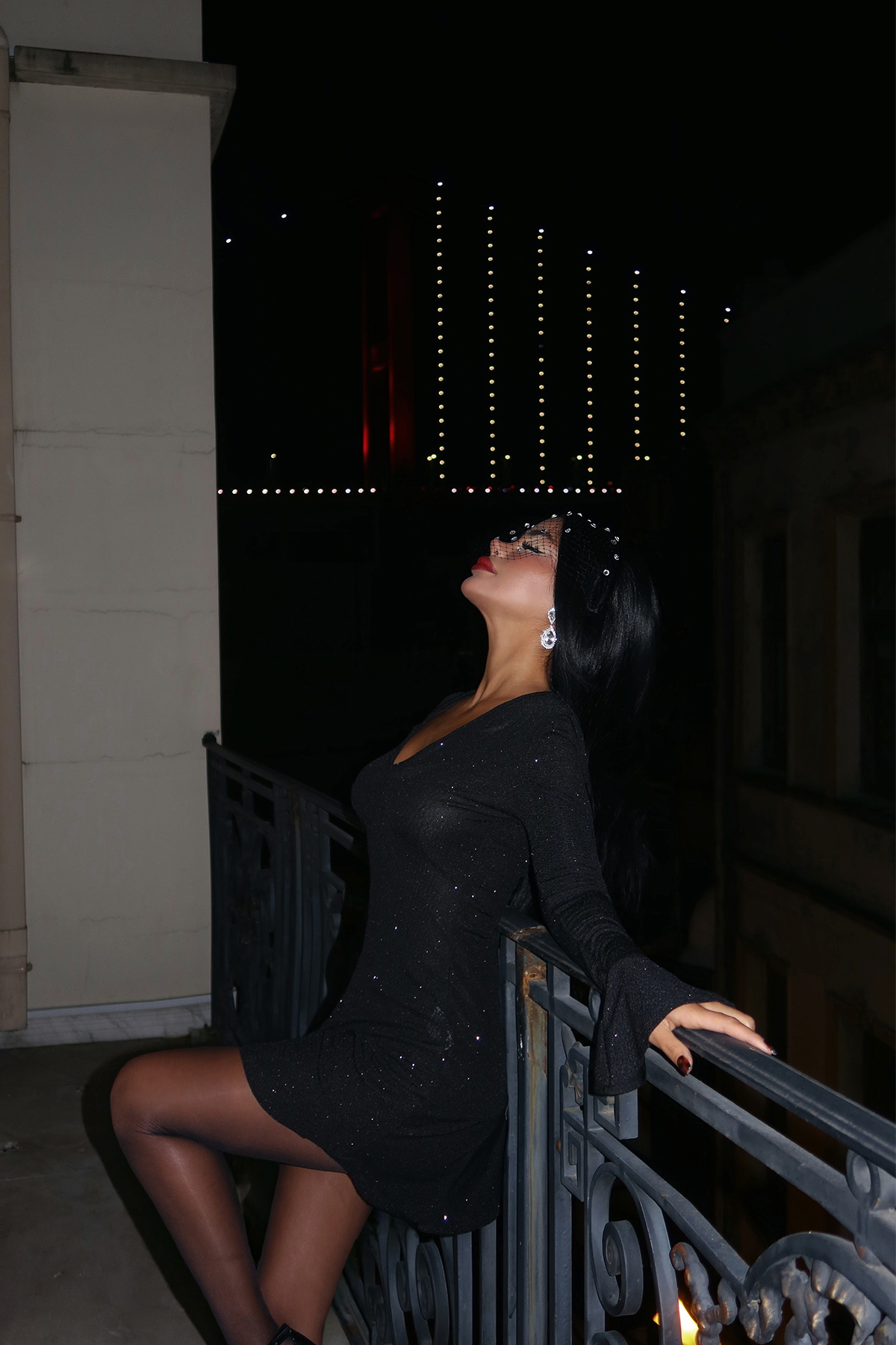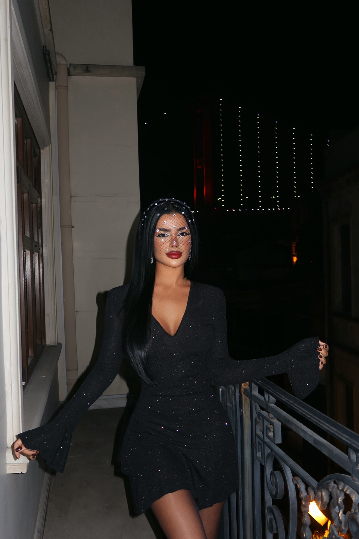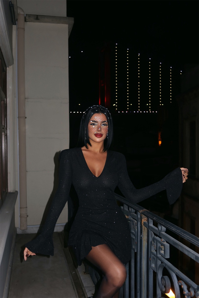 Siyah Simli V Yaka Mini Elbise, gece şıklığını tamamlayan büyüleyici bir parça! Simli dokusuyla ışıkta parlayan bu elbise, derin V yakası ve volanlı uzun kollarıyla sofistike bir hava katıyor. Vücudu saran yapısıyla feminen bir duruş sergileyen bu model, gece davetlerinden özel kutlamalara kadar her anınızda göz kamaştırmanızı sağlar. Zarif bir topuklu ayakkabı ve minimal aksesuarlarla kombinlendiğinde etkileyici bir görünüm yaratır.
