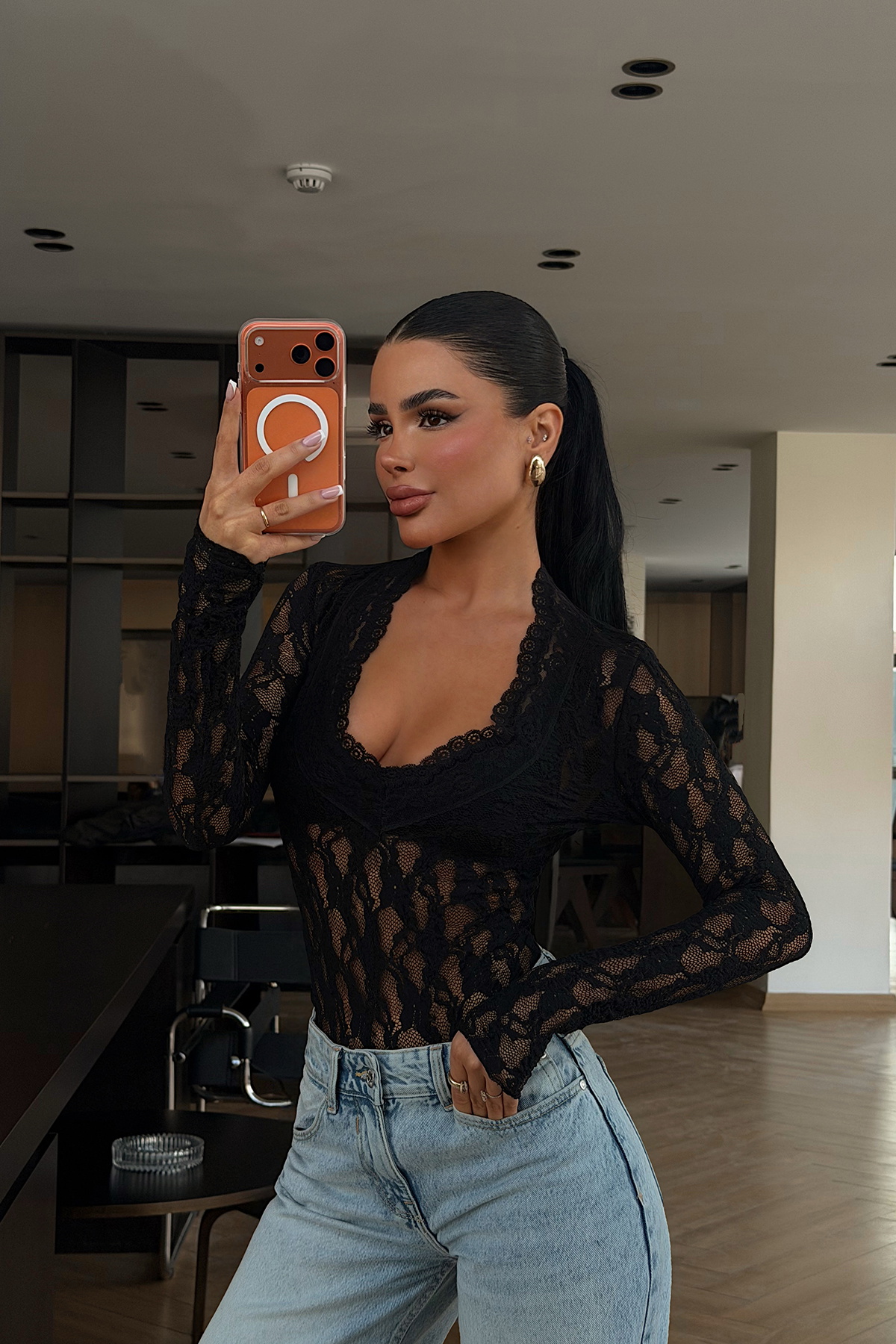 Zarif dantel dokusu ve transparan yapısıyla tasarlanan bu bluz, feminen ve modern bir stil sunar. V yaka formu dekolte hattını zarif şekilde vurgularken, uzun kollu tasarımı dengeli ve şık bir görünüm oluşturur. Esnek dantel kumaşı sayesinde vücuda uyum sağlayarak konforlu bir kullanım sunar.