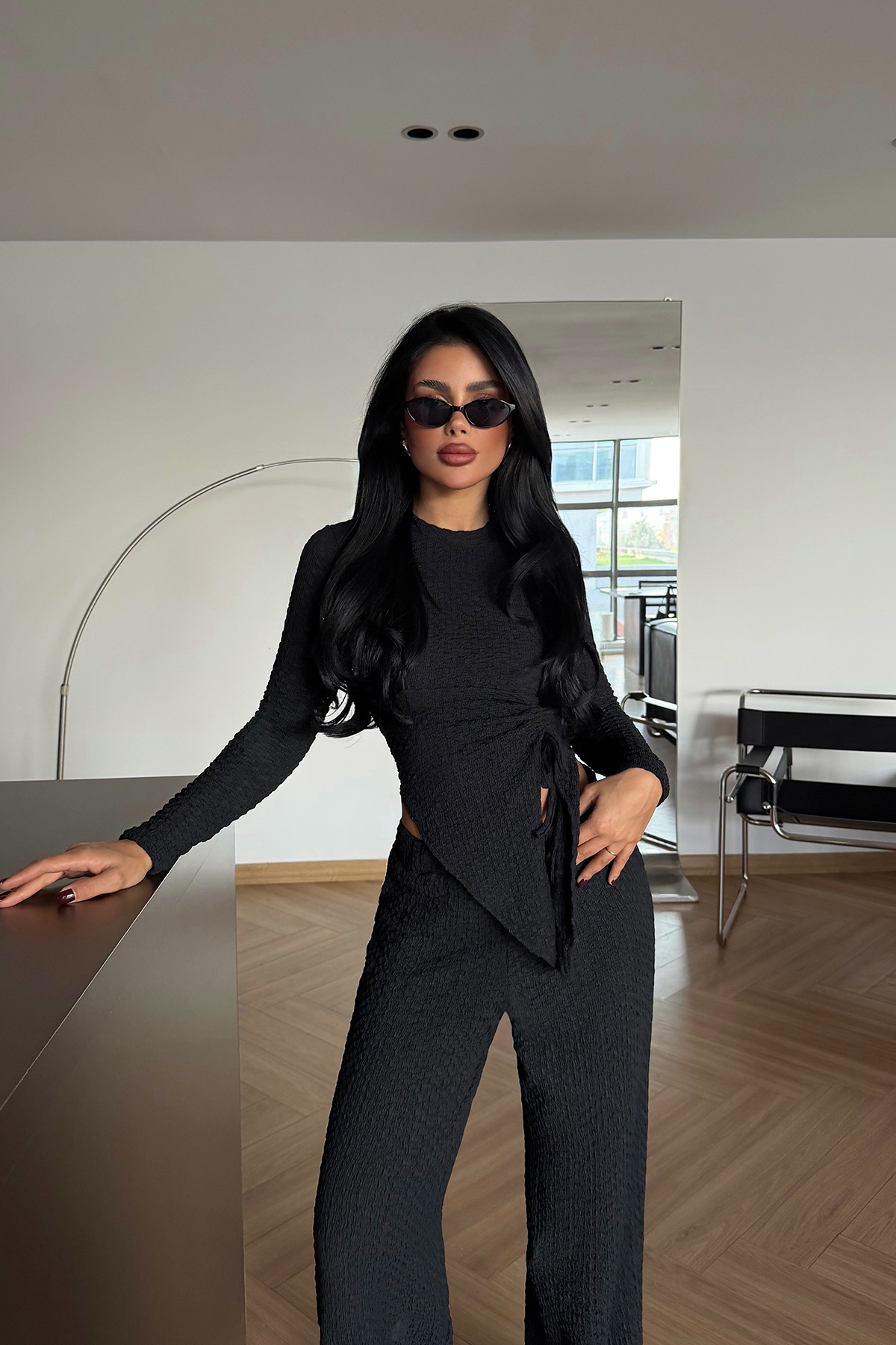 Derin siyah tonu ile modern çizgiyi yakalayan bu triko takım, rahat kalıbı ve şık dokusu ile günlük stilinizin ilk tercihi olacak. Üst ve altında uyumlu yapısı sayesinde tek başına kombini tamamlayan bir set sunar. Triko kumaşı yumuşak dokusu ve esnek yapısıyla gün boyu konfor sağlar.