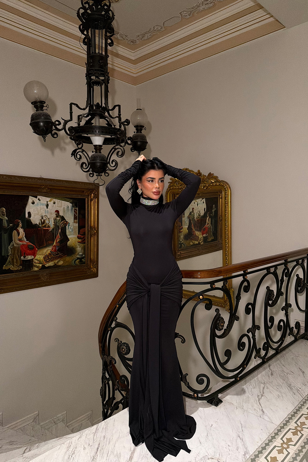 Vücuda oturan formu ve bel kısmındaki drapeli detayıyla öne çıkan uzun elbise, güçlü ve feminen bir siluet sunar. Uzun kollu ve yüksek yakalı tasarımı zarif bir duruş sağlar.