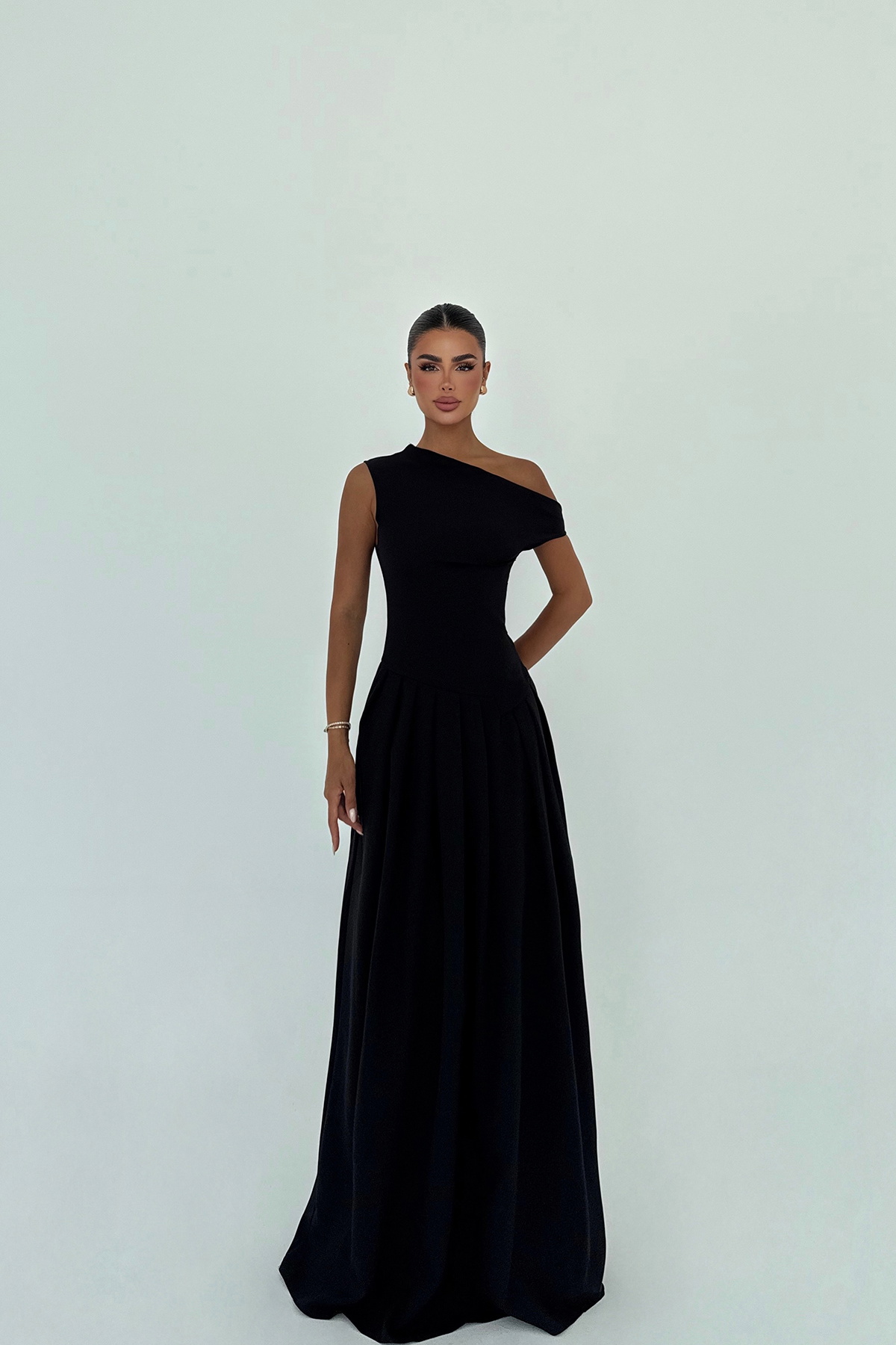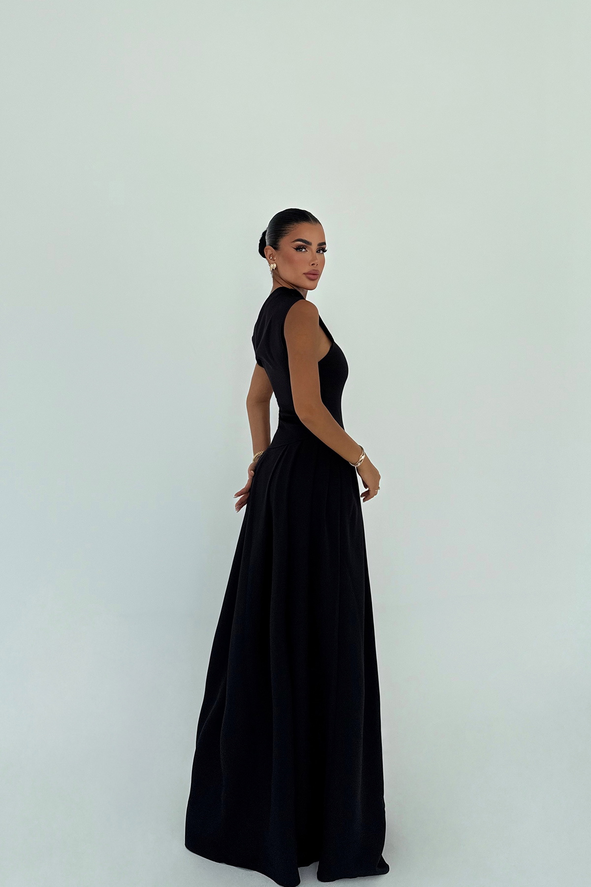 Siyah Bimala elbise, kayık yaka detayıyla şık ve feminen bir görünüm sunar. Vücuda oturan kesimi zarif bir duruş sağlar. Akıcı kumaşı sayesinde hem konforlu hem de özel davetlerde etkileyici bir kullanım imkanı verir.