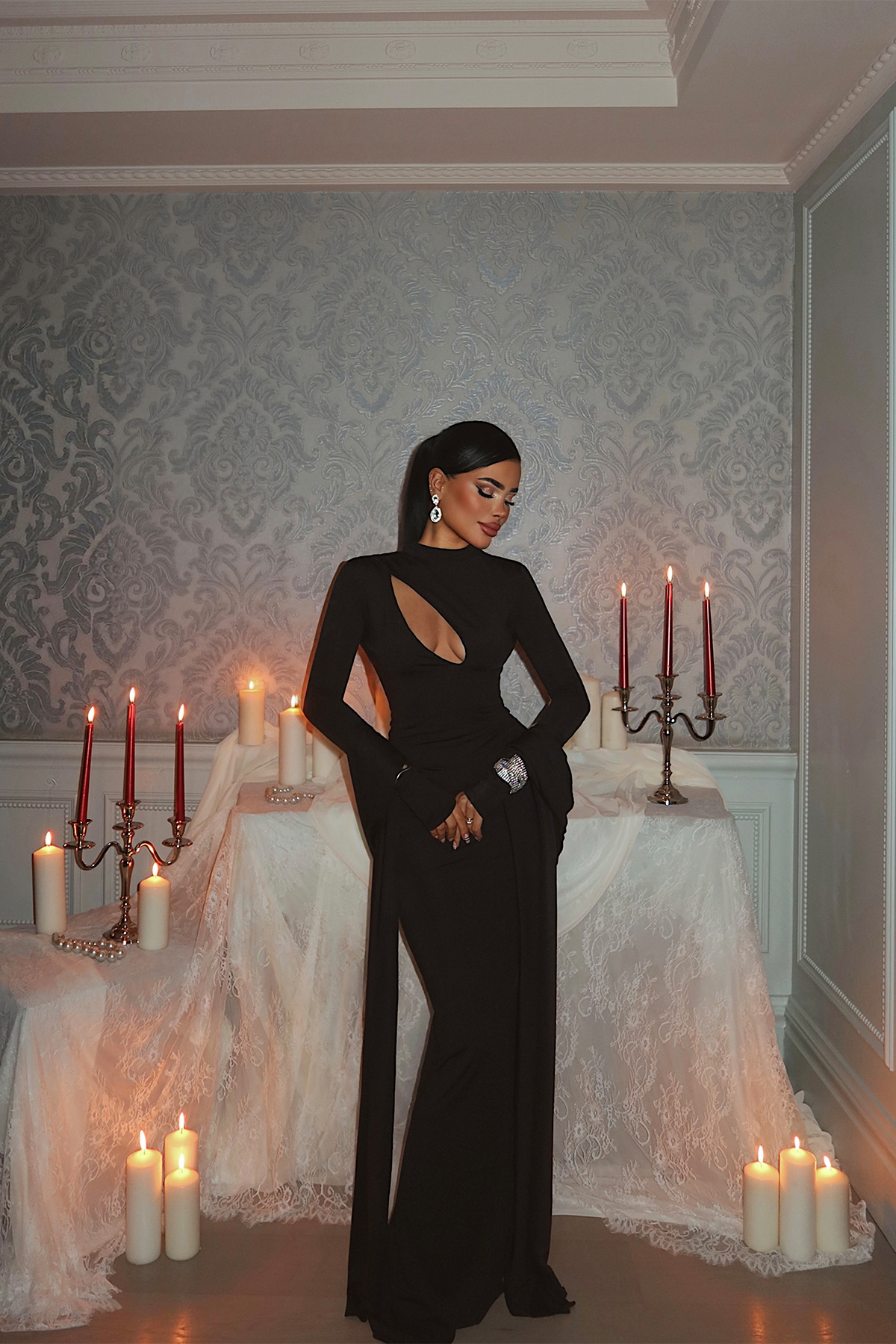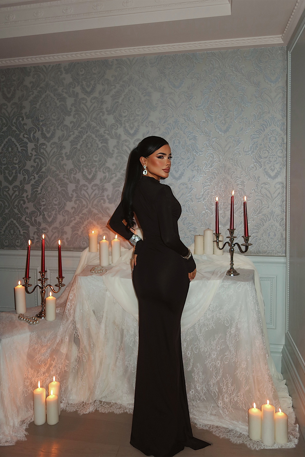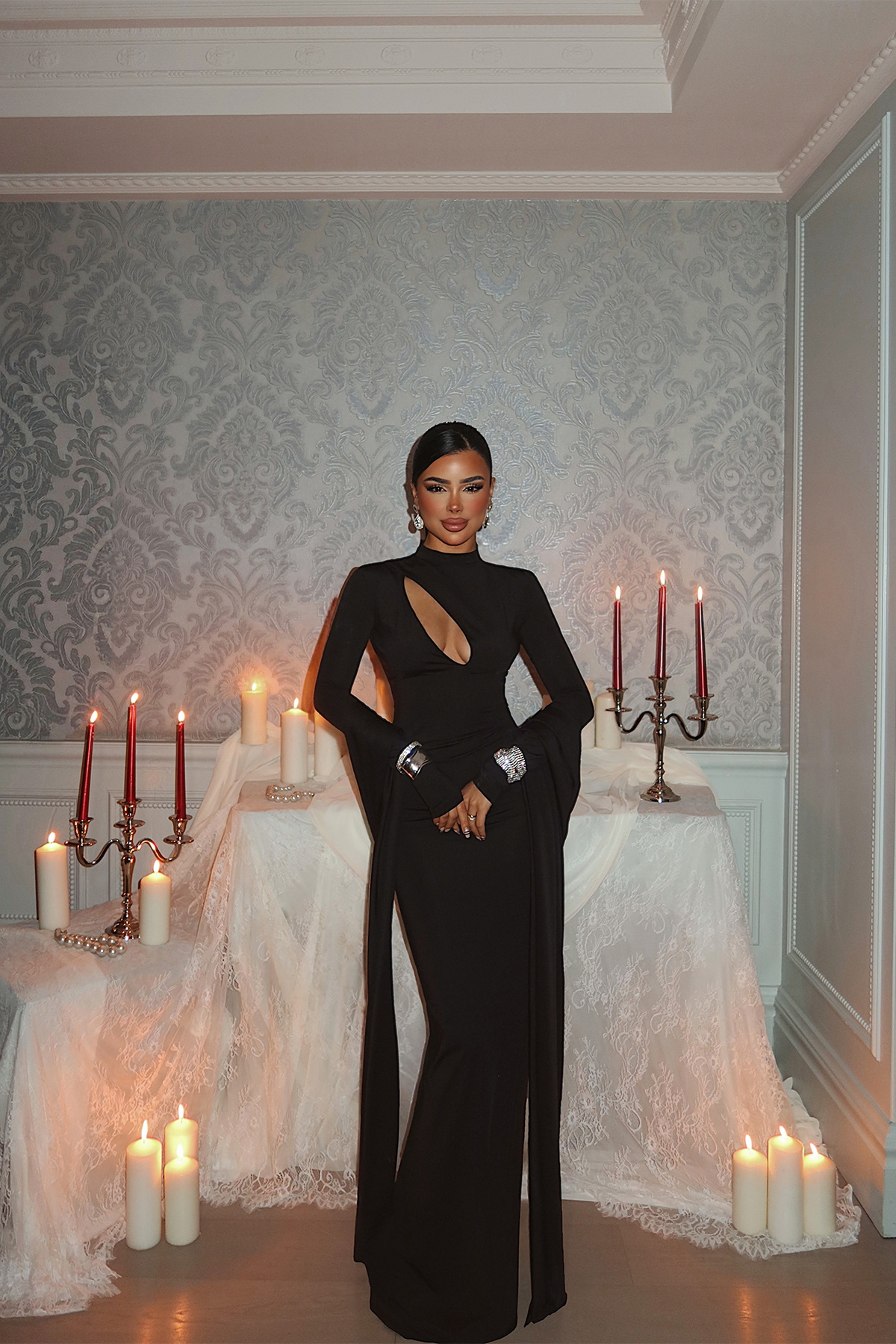 Vücuda oturan formu ve bel kısmındaki detayıyla feminen bir siluet sunan uzun elbise, göğüs dekoltesiyle modern ve iddialı bir görünüm kazandırır.
