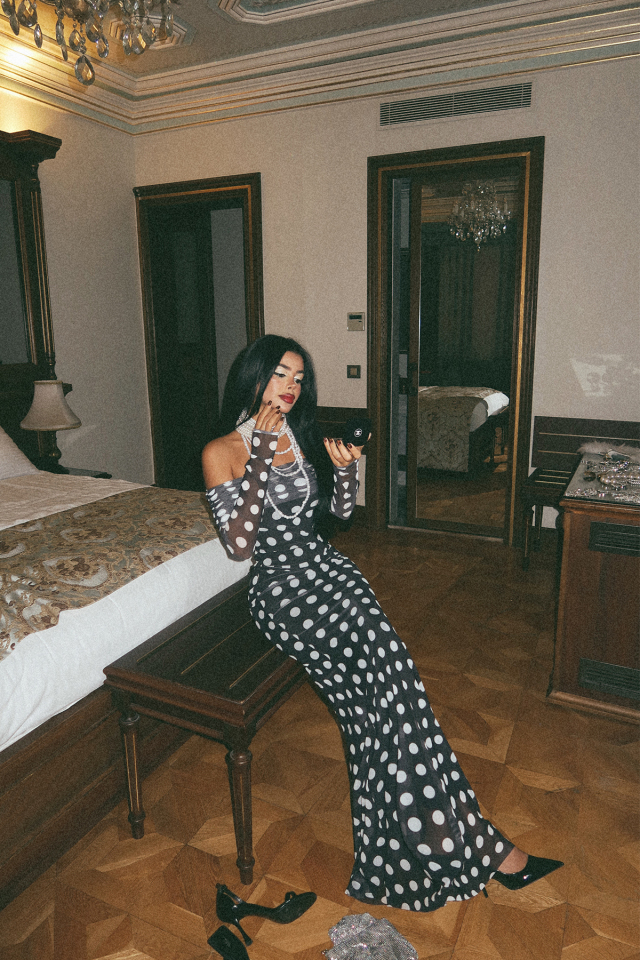 Siyah Uzun Kol Puantiyeli Elbise