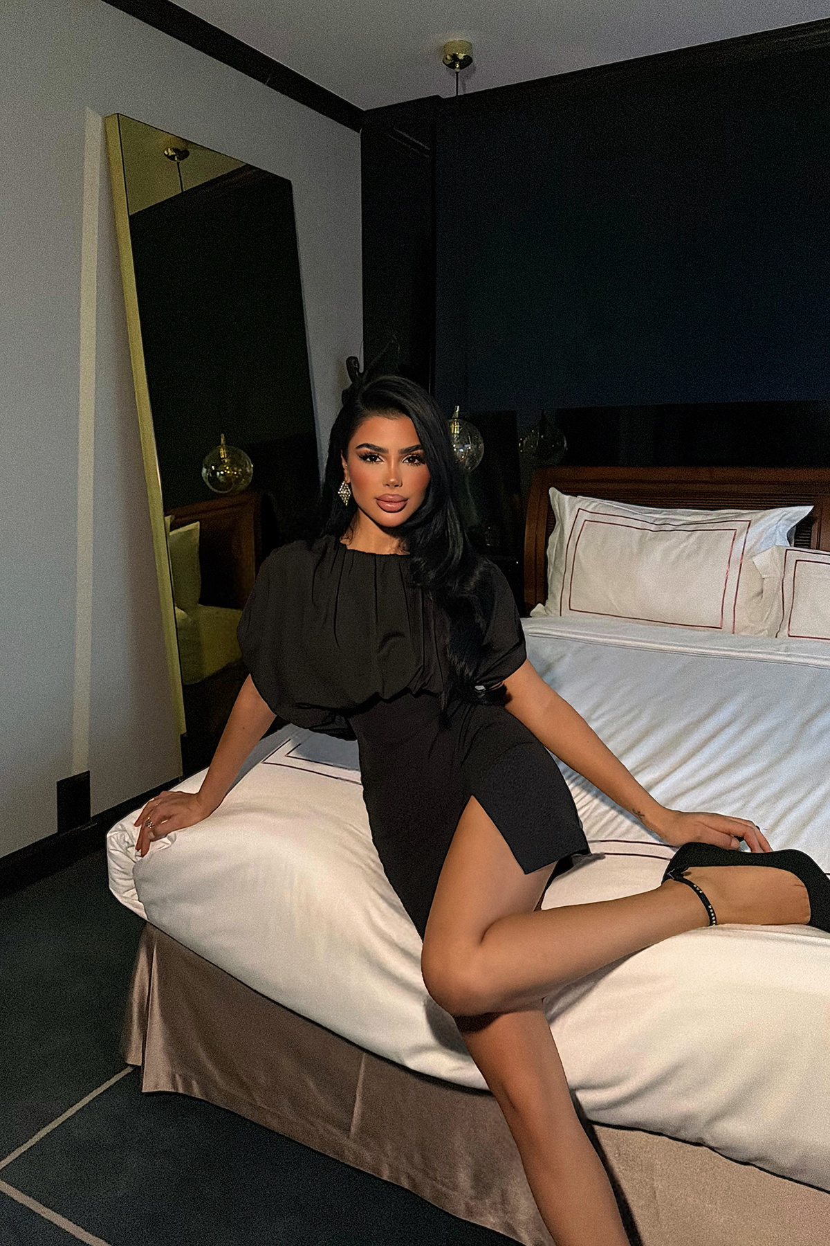 Etek kısmındaki yırtmaç ile öne çıkan mini elbise, modern ve feminen bir siluet sunar. Vücuda oturan formu zarif bir duruş sağlarken, sade ama iddialı tasarımıyla gece davetleri ve özel kombinler için şık bir tercih oluşturur.