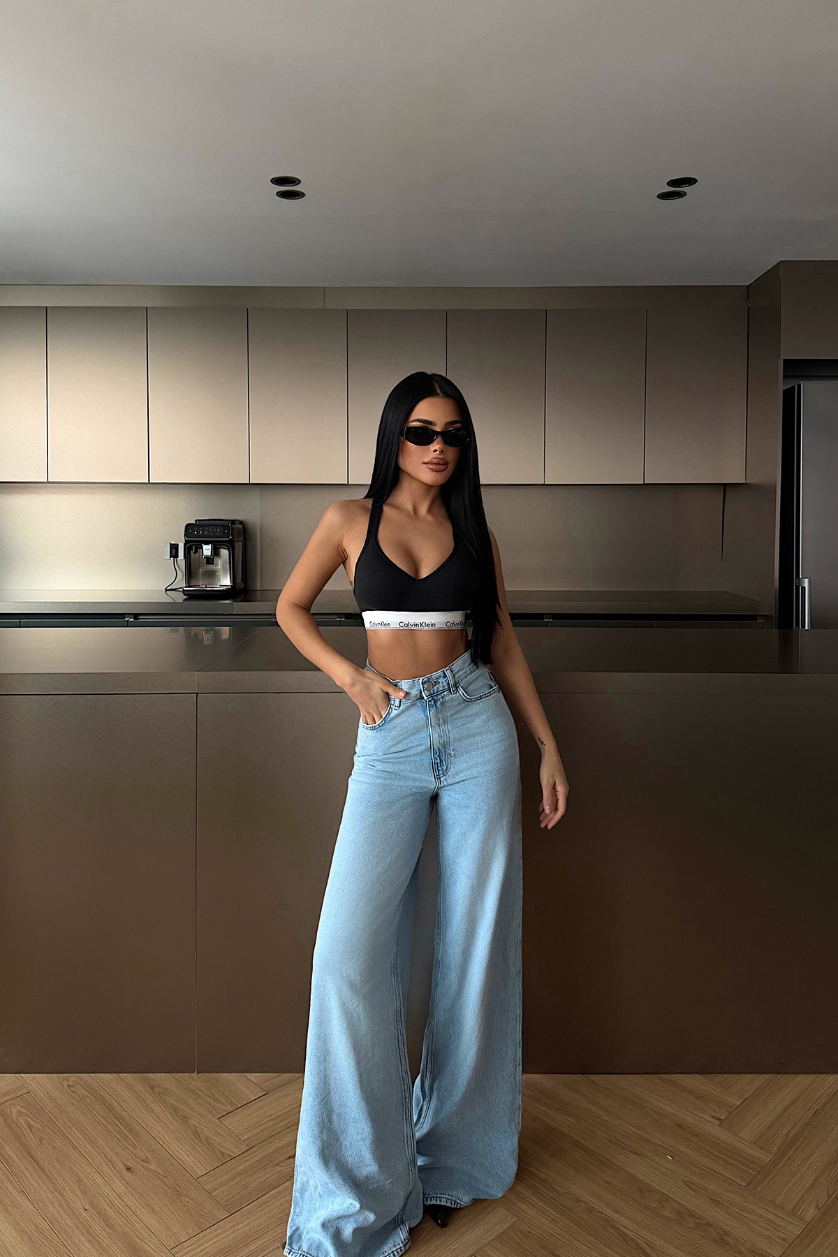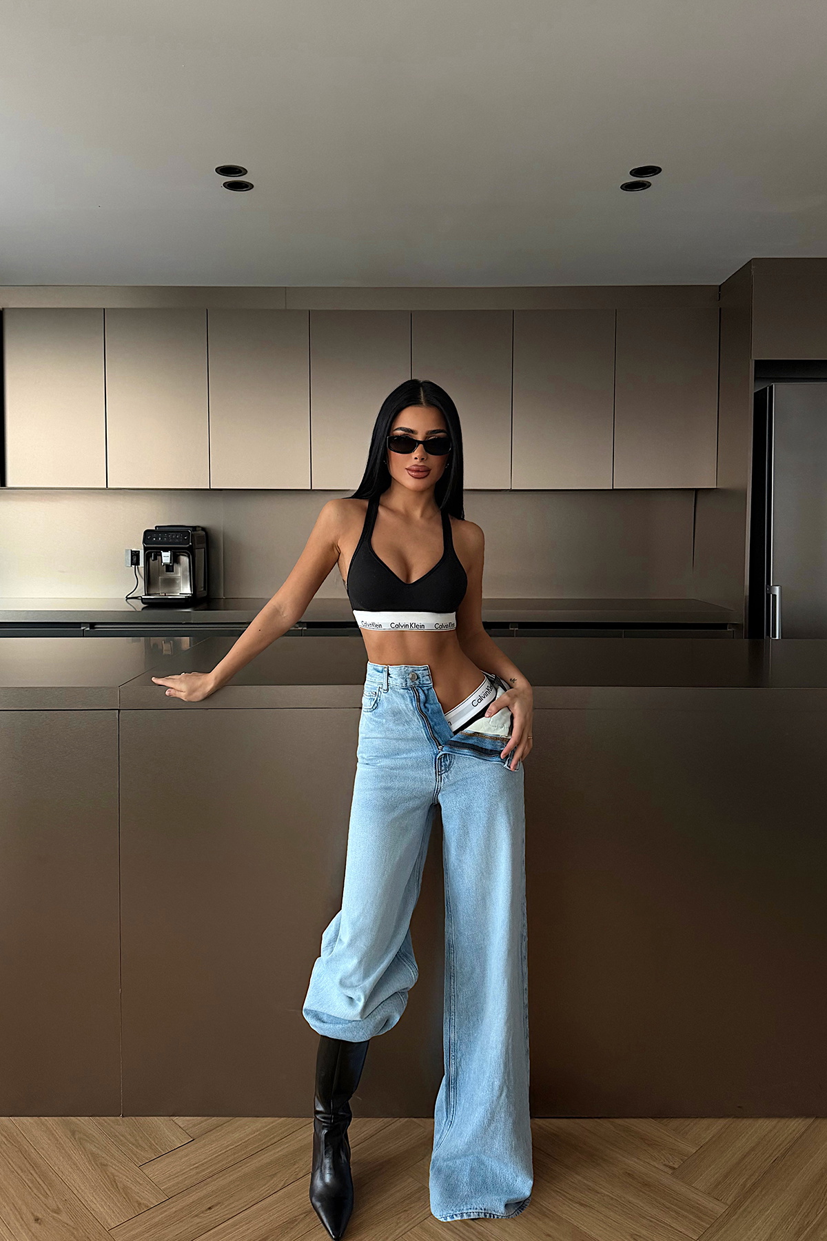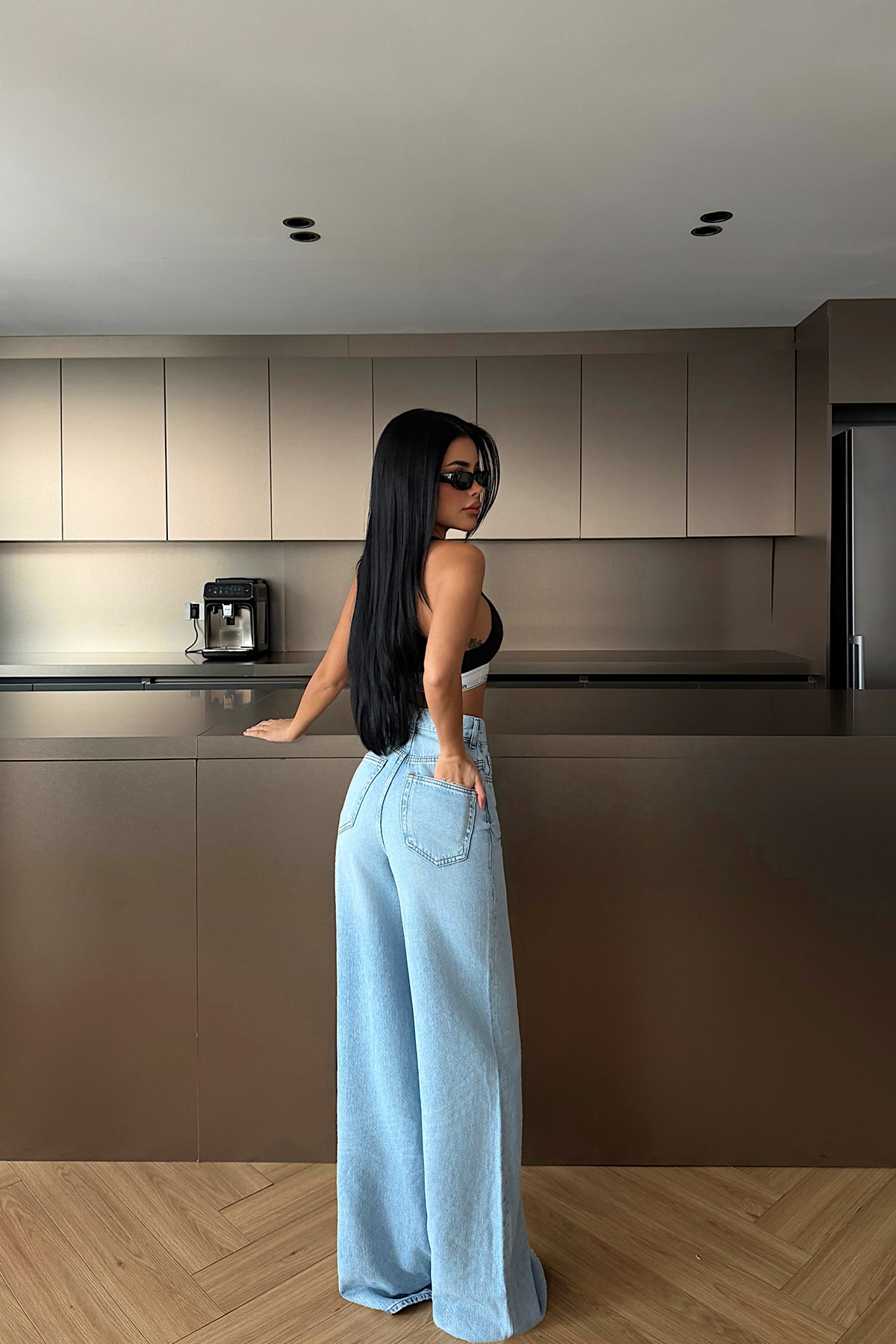 Düz paça kesimiyle öne çıkan yüksek bel jean pantolon, rahat kalıbı sayesinde gün boyu konfor sunar. Belden oturan formu vücut hatlarını dengeli gösterirken, zamansız tasarımıyla her stile kolayca uyum sağlar.