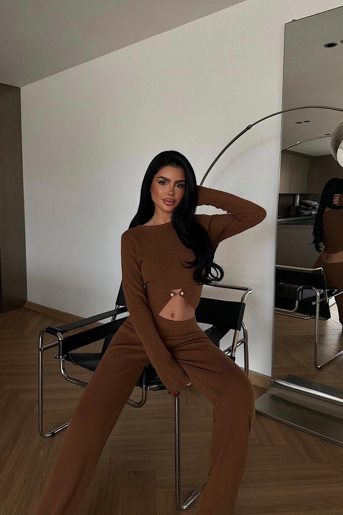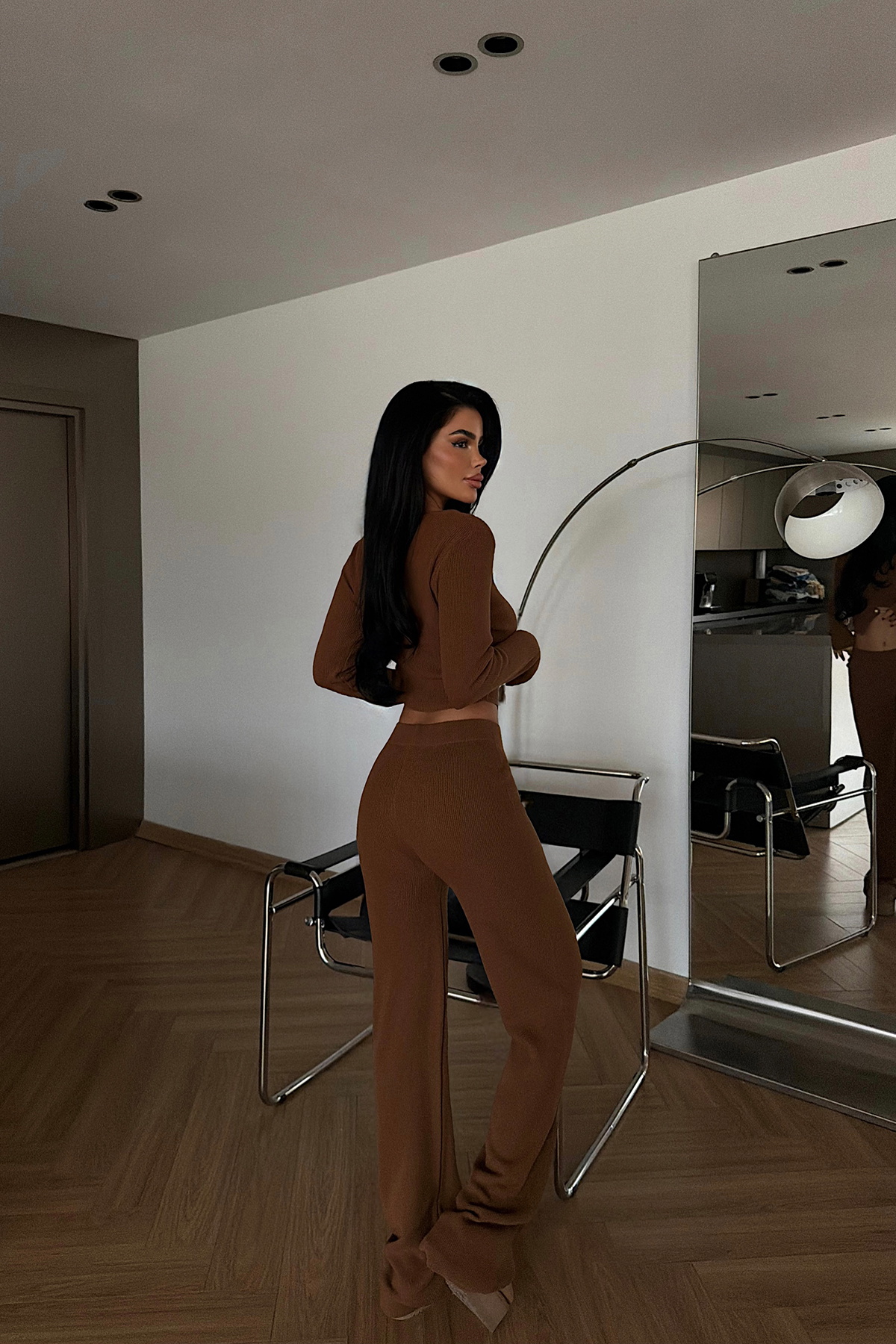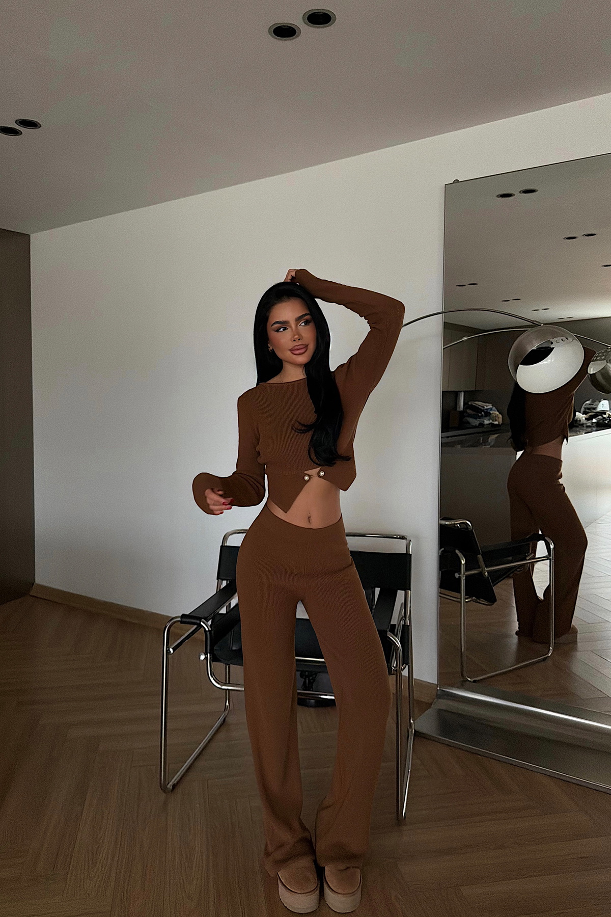 Düğme detayı ile tasarıma zarif bir karakter kazandıran iki parçalı triko settir. Üst parça, yumuşak triko dokusu ve önden düğme kapama detayıyla minimalist bir şıklık sunar. Alt parça, aynı dokuda devam eden triko örgüyle dengeli görünüm sağlar.