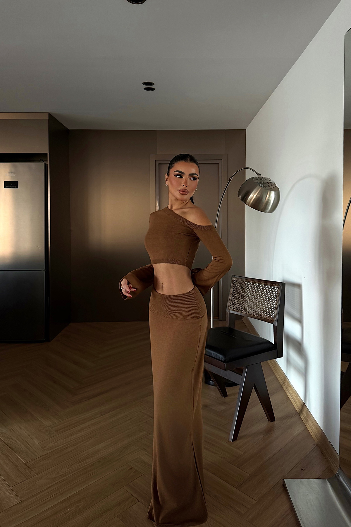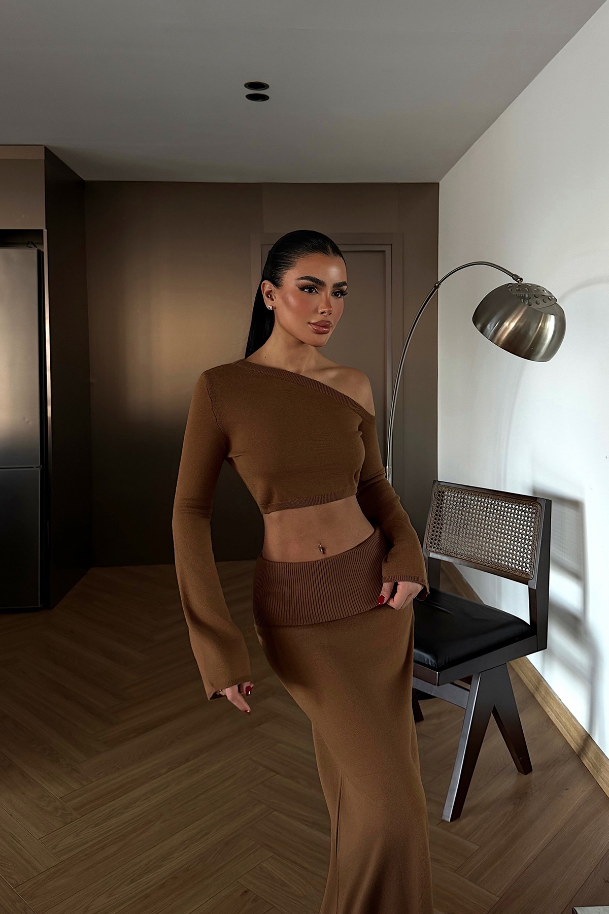 Taba etekli triko takım yumuşak ve nötr vizon tonu ile sade, zarif bir duruş sergiler. Takım üstü sade kesim ve nötr rengiyle minimal bir görünüm sunarken, alt etek kısmı klasik bel ve paça hattına sahiptir.