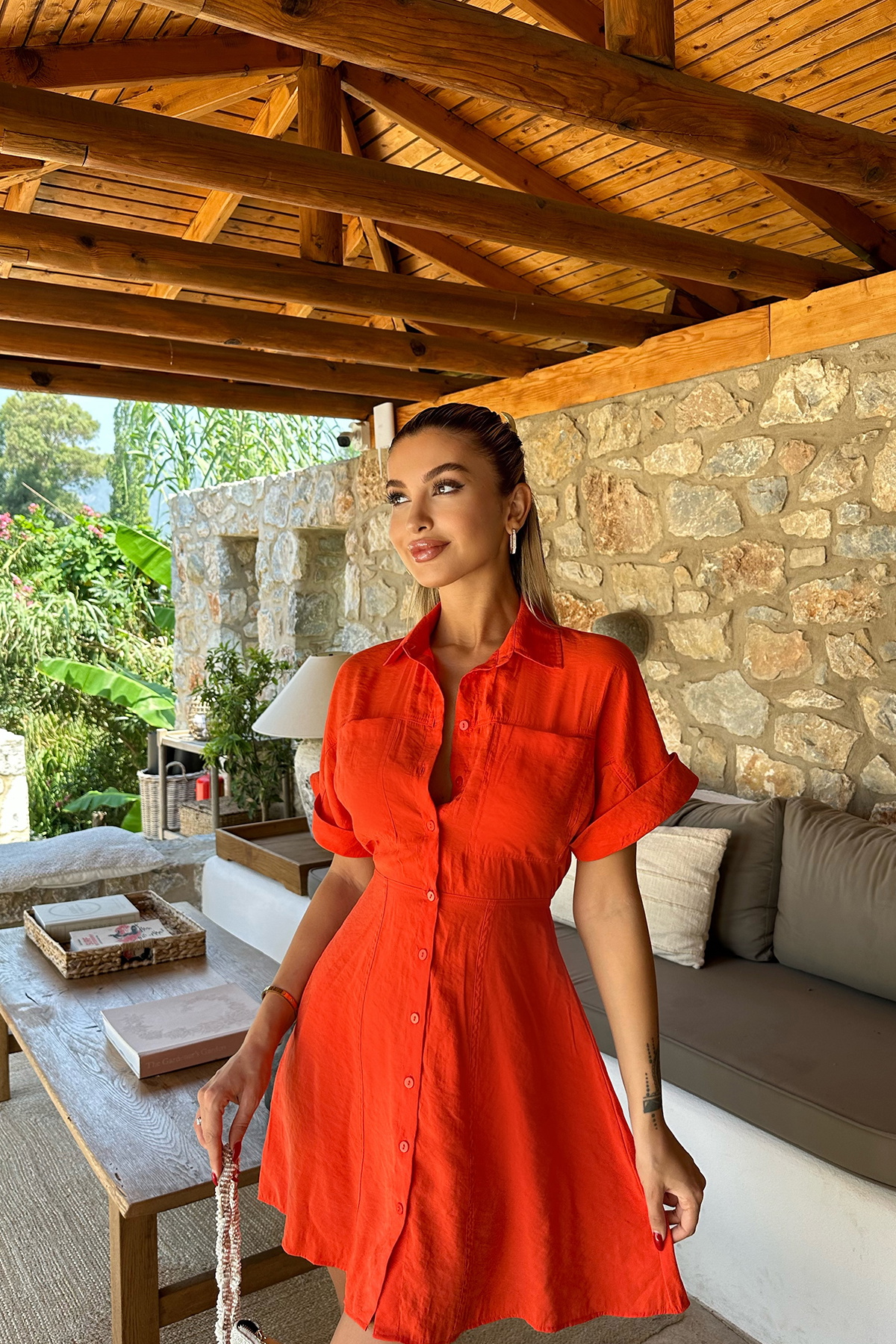 Turuncu Cep Detay Önü Düğmeli Elbise