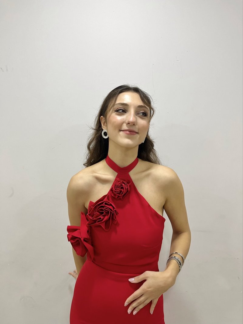 Elbiseye bayıldım. Sadece Gül detayı olan bölge pot duruyor ve orantısız onu da çift taraflı bantla hallettim tam kalıp vücudu sarıyor 57 kilo boy 169 bilekte bitiyor