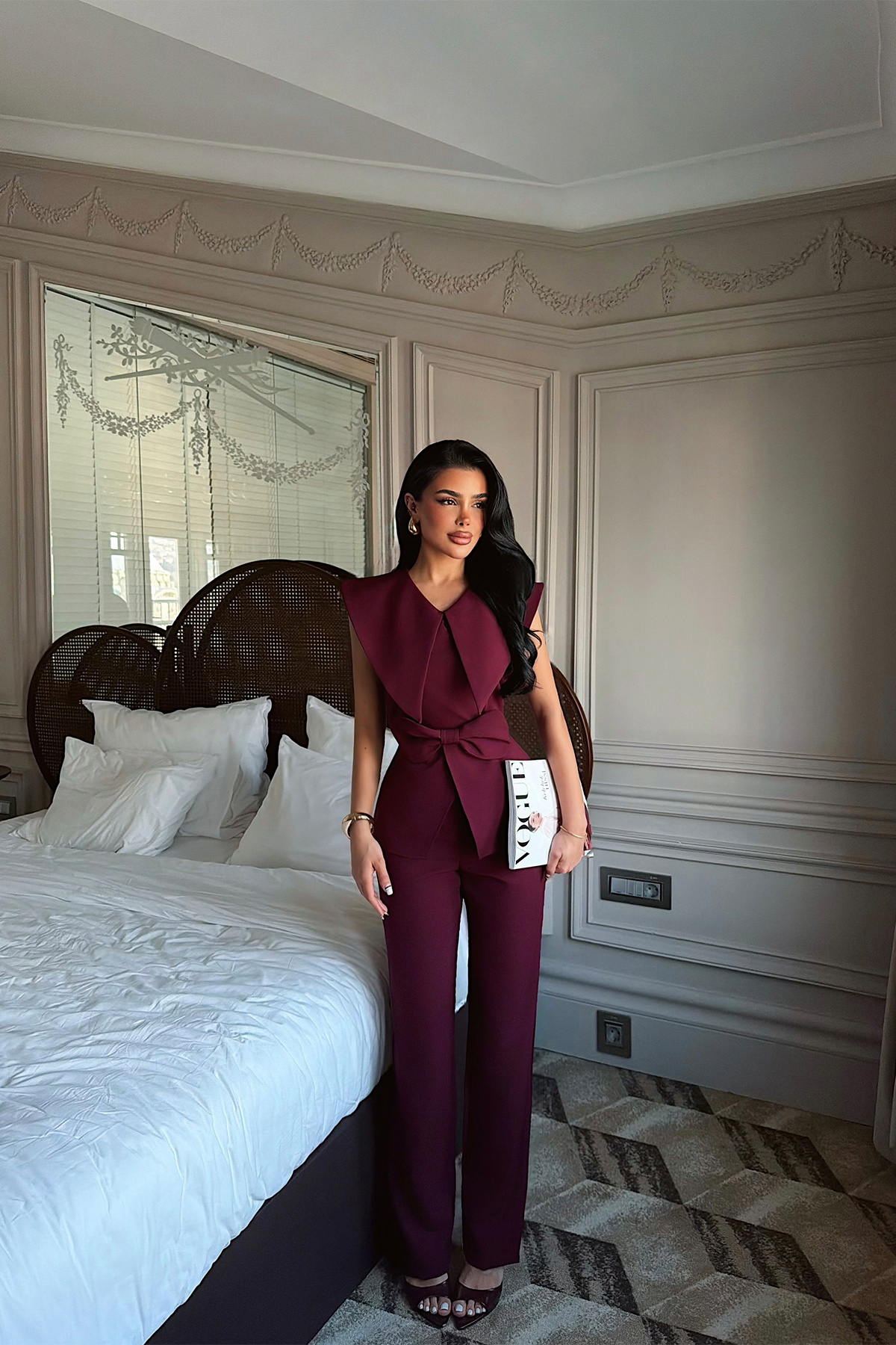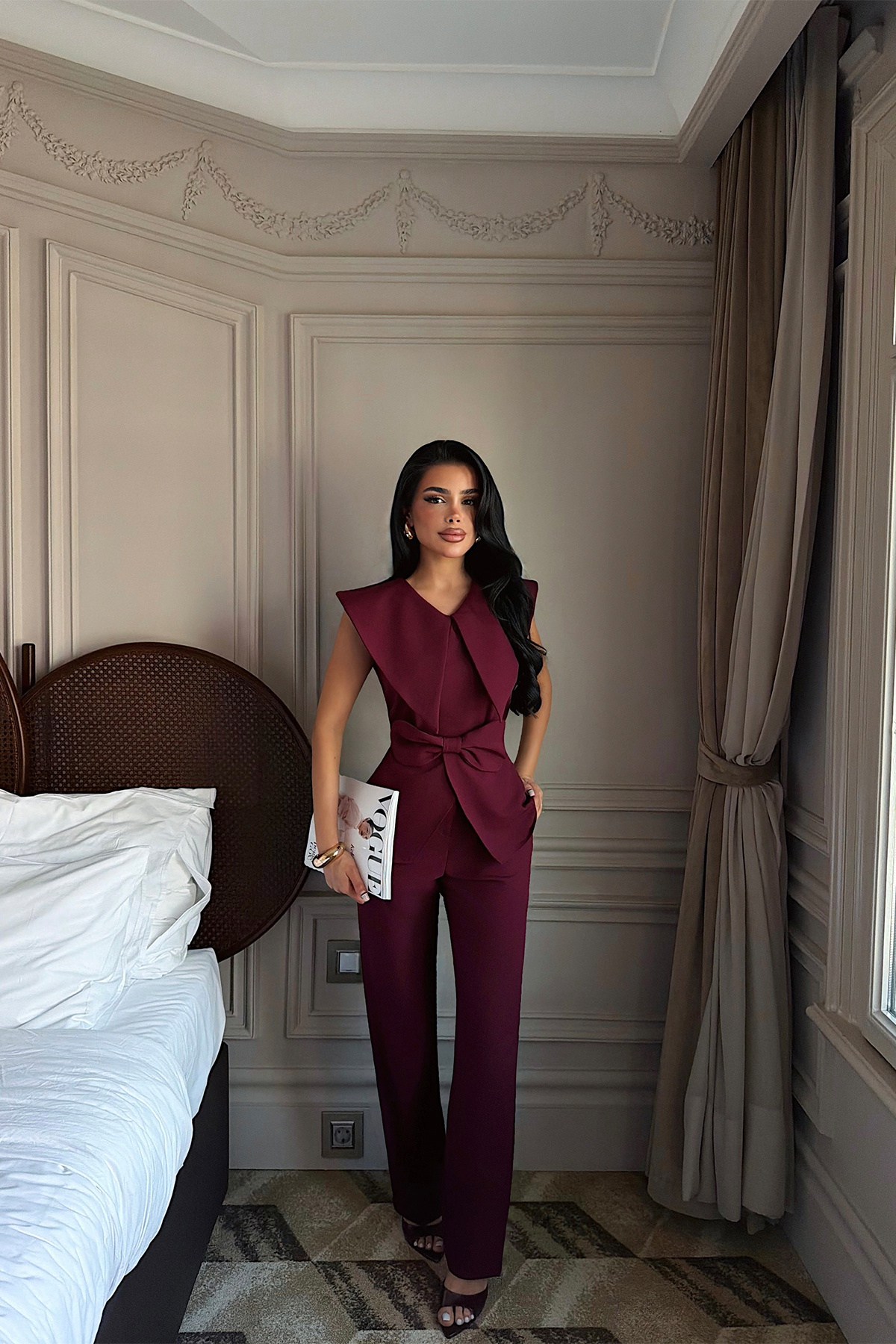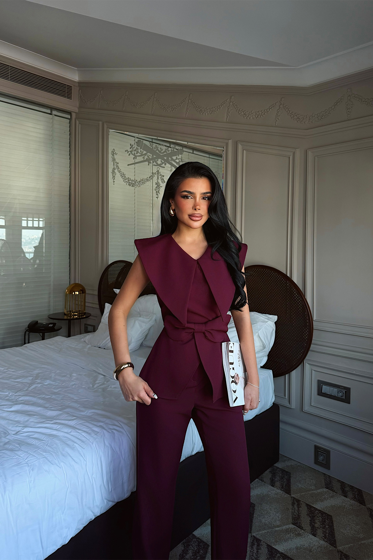 Tok ve formunu koruyan kumaşıyla öne çıkan bu takım, üst ve alt parçadan oluşur. Üst parçada yer alan fiyonk detayı tasarıma feminen bir vurgu katarken, keskin omuz hattı ve düz düşen form daha güçlü bir görünüm sağlar. Ön kısmındaki katlı yapı hareket kazandırırken, sade ve net bir duruş sunar.