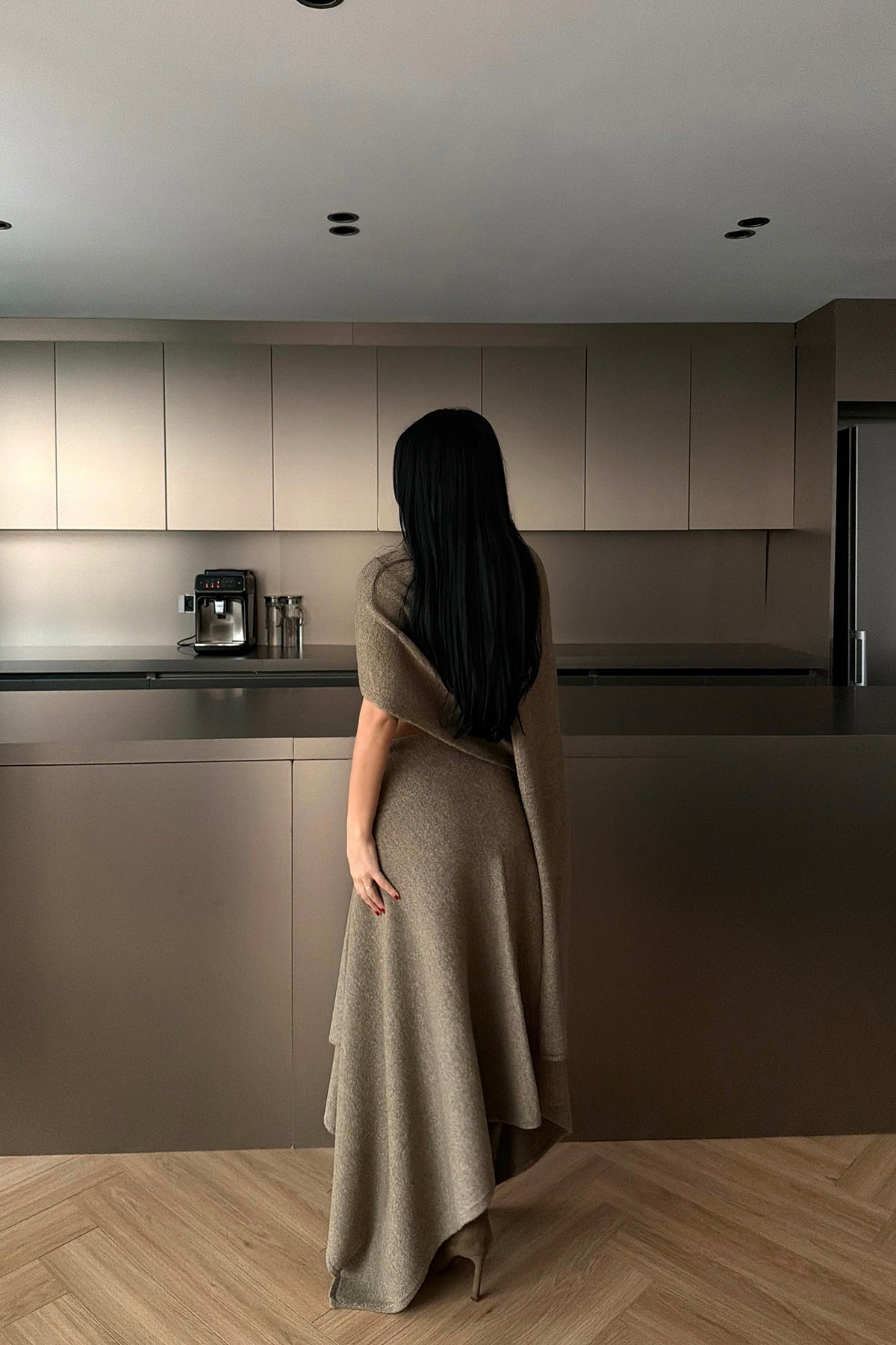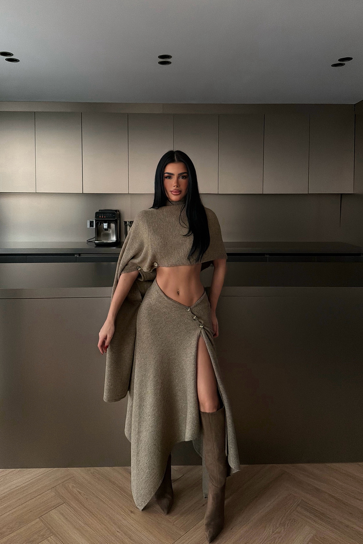 Bu takım; vizon renginde, yumuşak dökümlü kumaştan oluşan modern iki parçalı bir settir. Asimetrik kesimi ve kısa formuyla minimal ama dikkat çekici bir siluet oluşturur. Alt etek ise yüksek bel, çapraz bağlama detayı ile öne çıkar. Derin yan yırtmacı, eteğe akışkan bir görünüm kazandırırken yürüyüşte hareketli bir duruş sağlar.