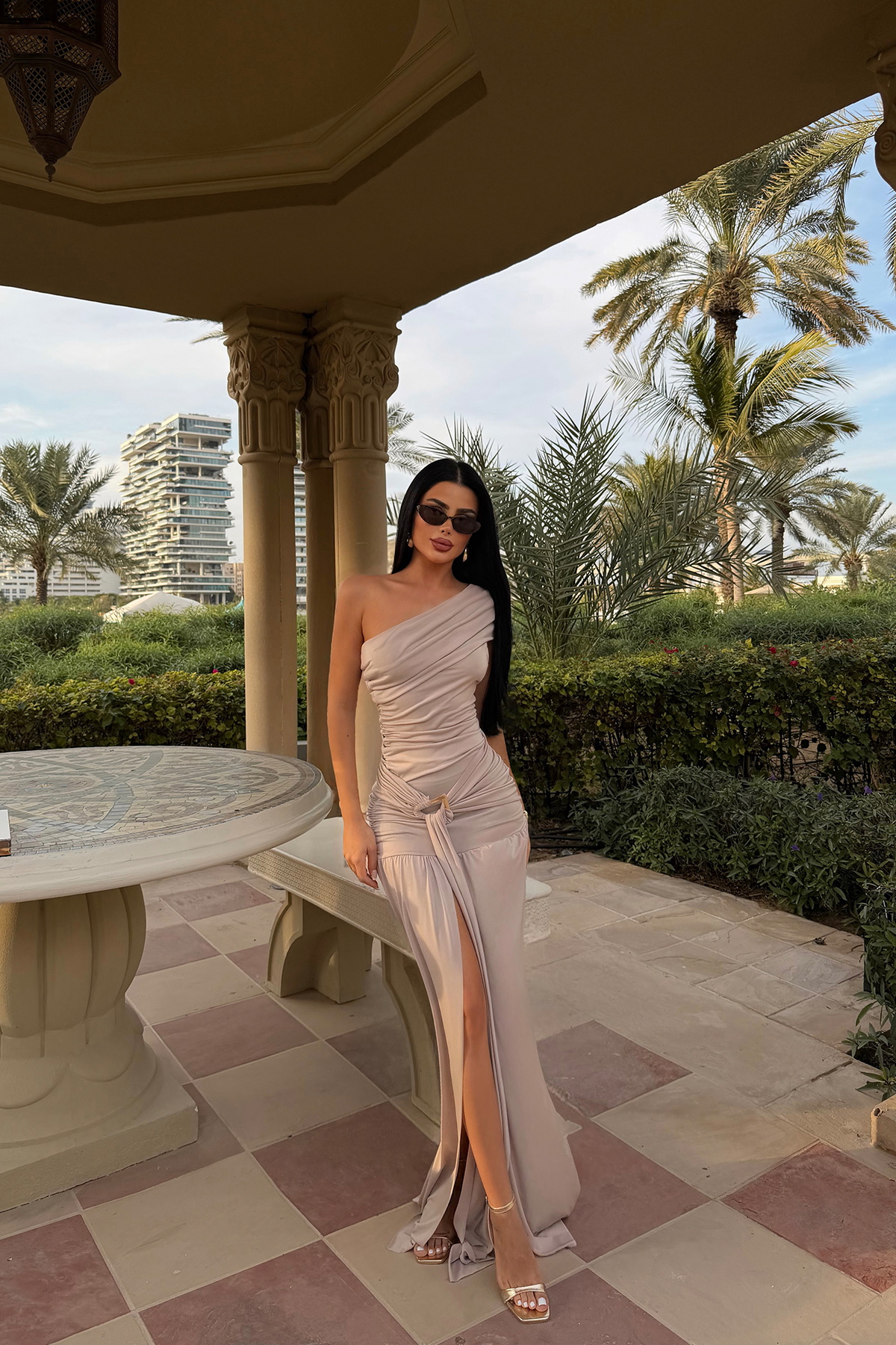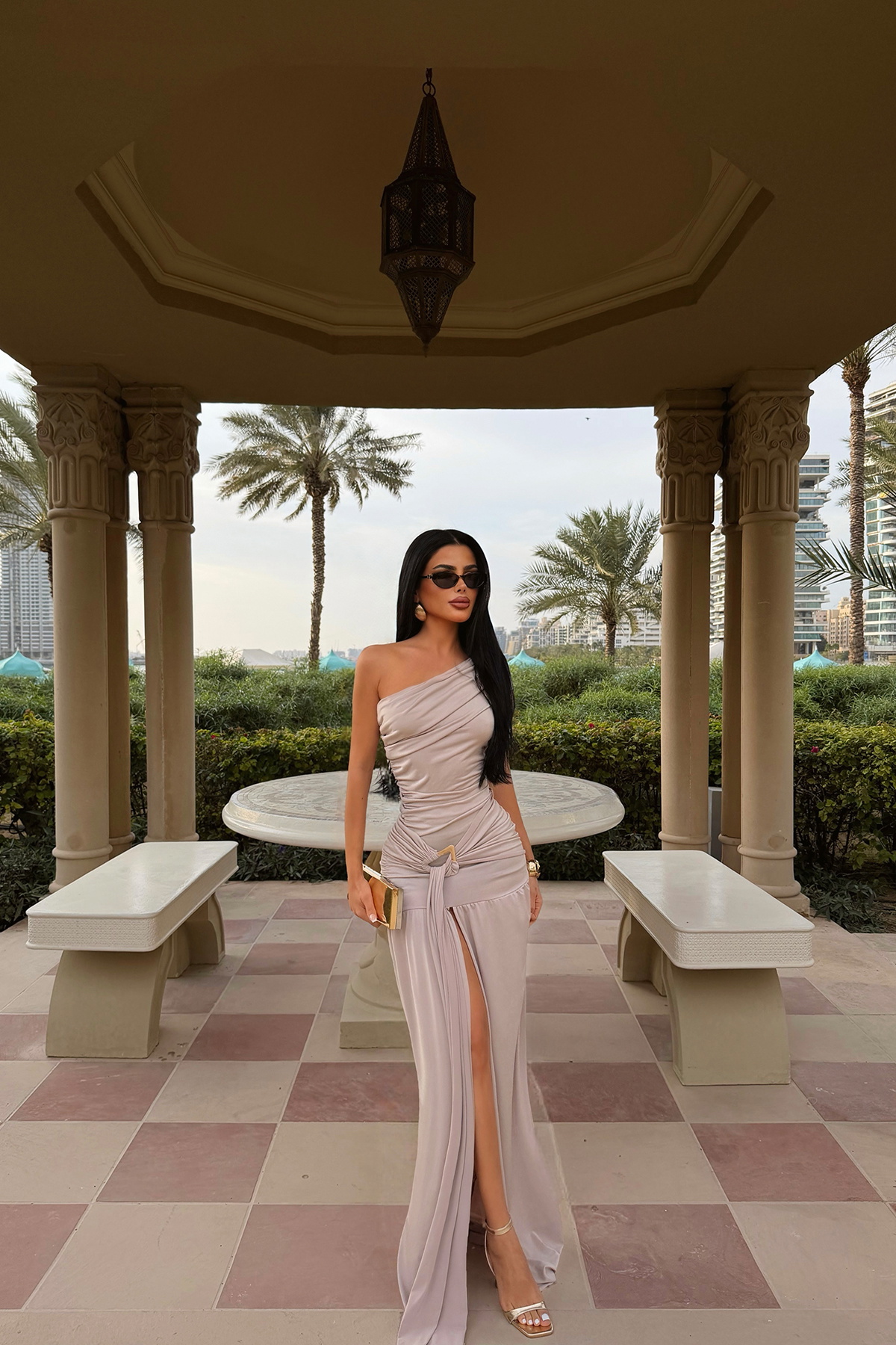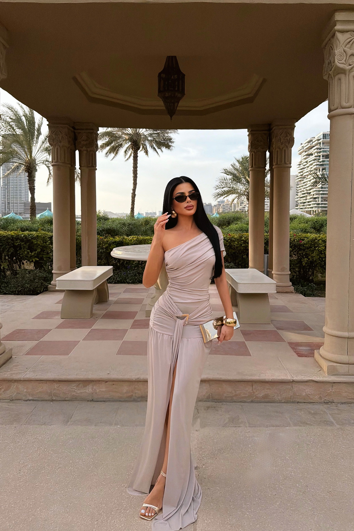 Tek omuz formu ve drapeli yapısıyla öne çıkan bu yırtmaçlı elbise, feminen ve iddialı bir siluet sunar. Yüksek yırtmaç detayı hareket özgürlüğü sağlarken, vücuda uyumlu kesimi şık bir duruş kazandırır. Davetler, özel organizasyonlar ve gece kombinleri için ideal bir elbisedir.