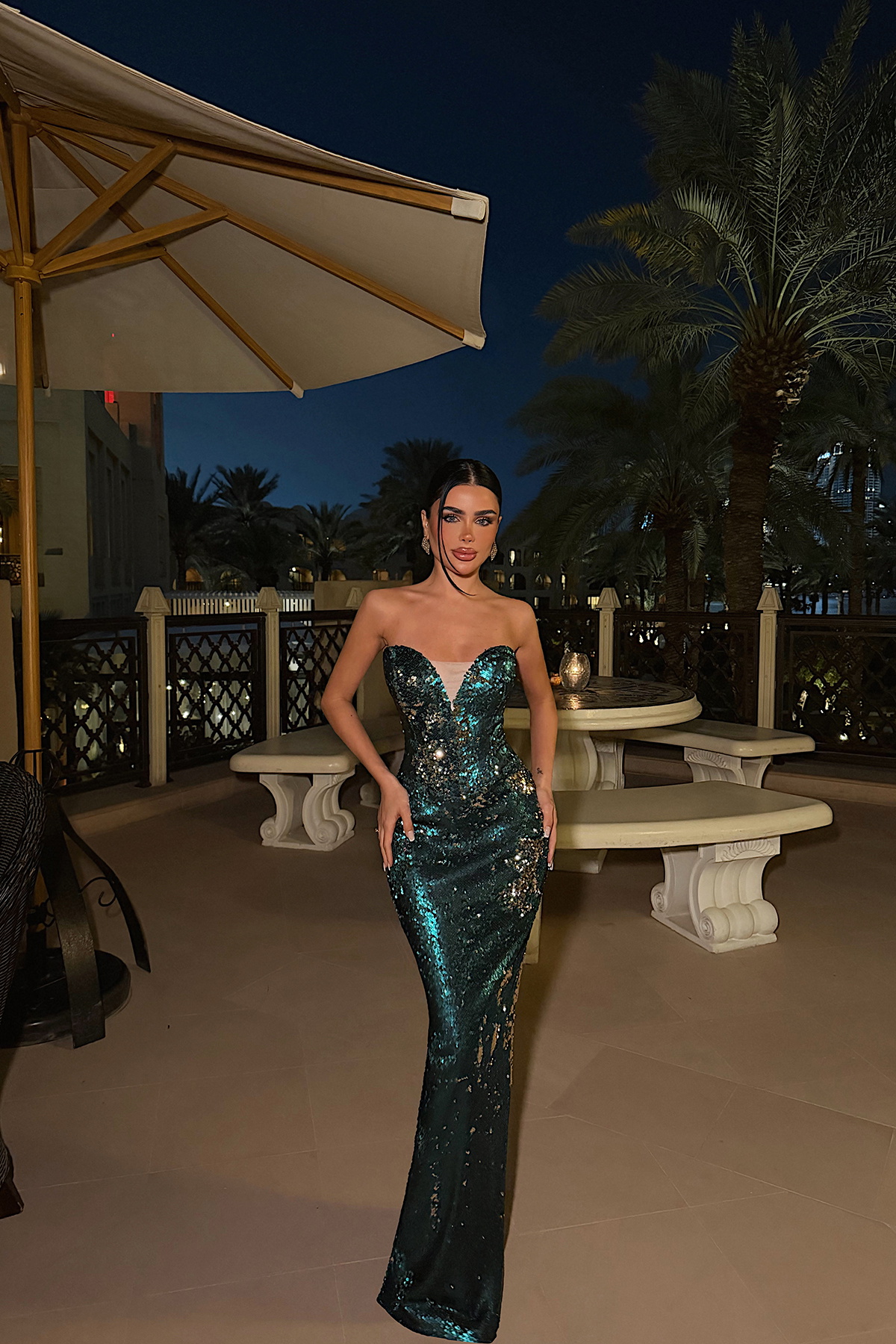 Göz alıcı payet işlemeleriyle tasarlanan bu uzun abiye elbise, özel davetlerde tüm bakışları üzerine çeker. Straplez formu ve vücuda oturan kalıbı sayesinde feminen silueti ön plana çıkarırken, elbise boyunca yer alan payet detayları ışıltılı ve sofistike bir görünüm sunar.